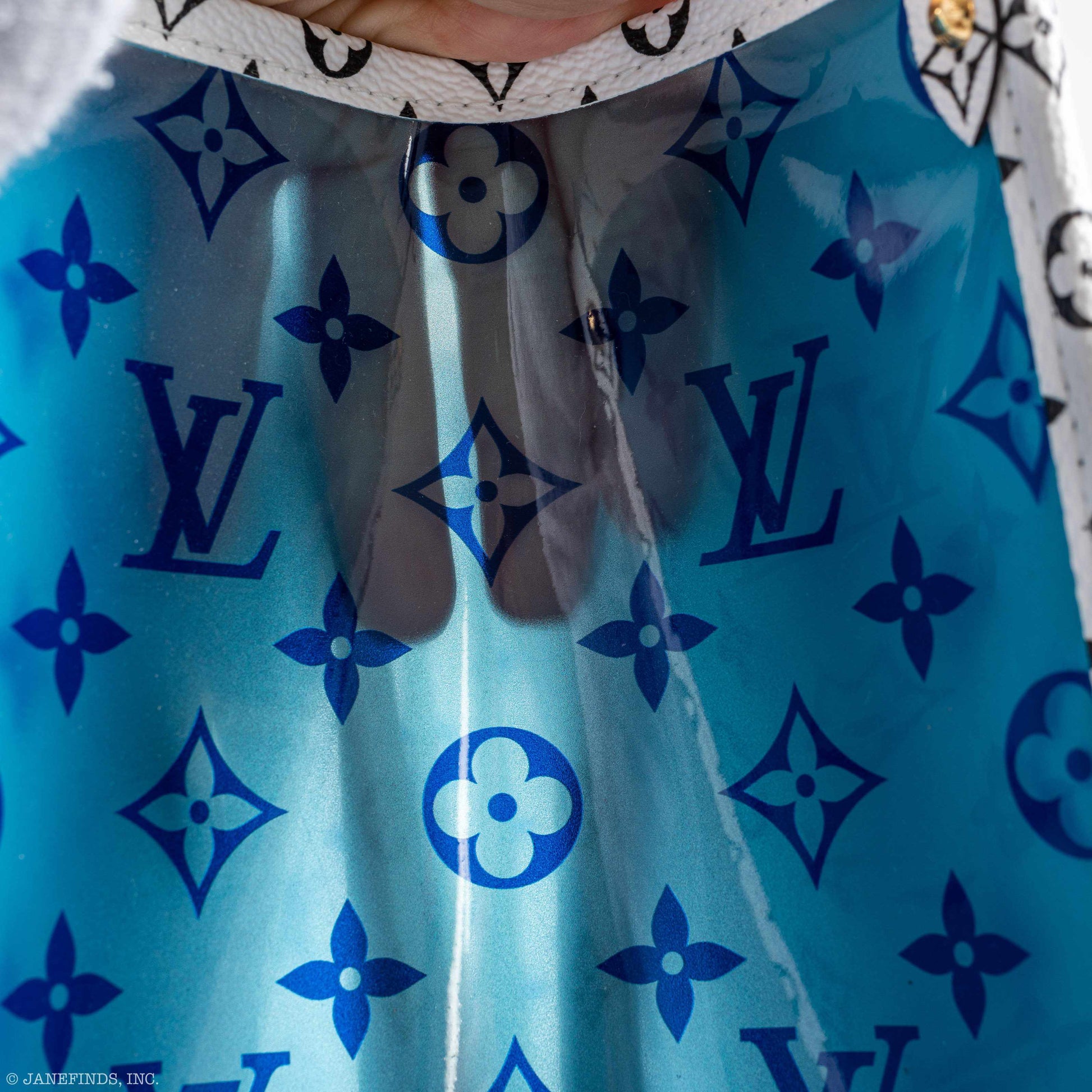Louis Vuitton Limited Edition. From the Spring 2019 Collection. Blue and multicolor monogram giant coated canvas Louis Vuitton Onthego tote with brass hardware,dual flat shoulder straps, dual rolled top handles, white and black monogram coated canvas trim, multicolor Hamptons appliqué at front, cobalt, and blue monogram PVC trim, light blue canvas lining, three interior pockets; one with zip closure and clasp closure at top. Includes box and dust bag.