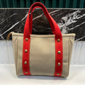 Louis Vuitton sac en tissus beige et rouge avec plaque dorée, collection Antigua.