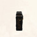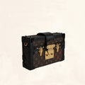 Characteristics: This piece can be cross-body or, for evening, carried as a clutch. It features black-leather trim at all corners, black studded lining at the joints with brass buckles and a brass press lock. The interior is lined with Malletage-print sheepskin in a beautiful and contrasting black and beige color-scheme. The top corners of the handbag include a magnetic closure, accentuated throughout with a canvas trim.