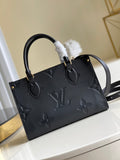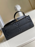 Inspired by Louis Vuitton’s famous Sac Plat from 1968, the Onthego PM tote is fashioned in Monogram Empreinte leather, embossed with a Giant Bicolor Monogram pattern. Articulated top handles and an adjustable, removable strap offer various carry options.