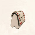 Characteristics: This stylish waist-length cross-body shoulder bag is crafted of textured leather in white and has red and black leather stitching along the flap. The bag features a polished silver V on the facing flap. This opens to a black microfiber interior with a small patch pocket.