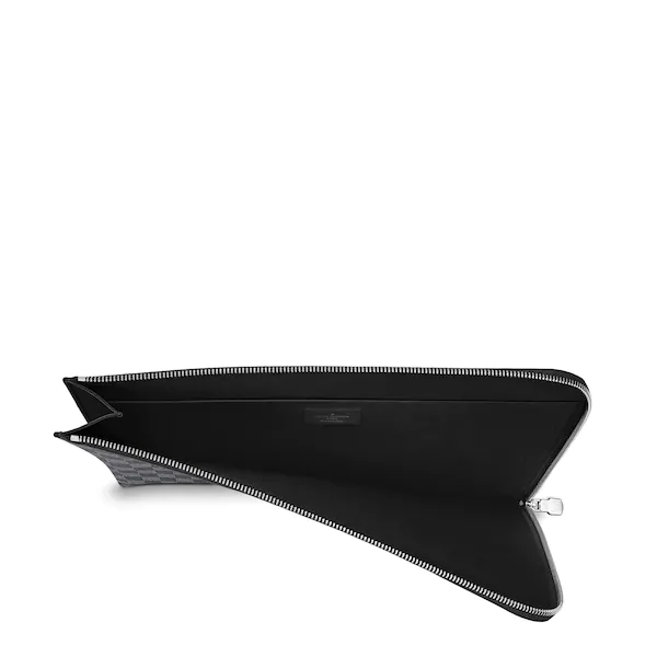 Louis Vuitton’s Pochette Jour is large enough to hold a laptop easily. This new version in Damier Graphite offers more capacity and a very large opening. This supple and versatile design can be carried as a clutch or a document portfolio, or slipped inside a larger bag.