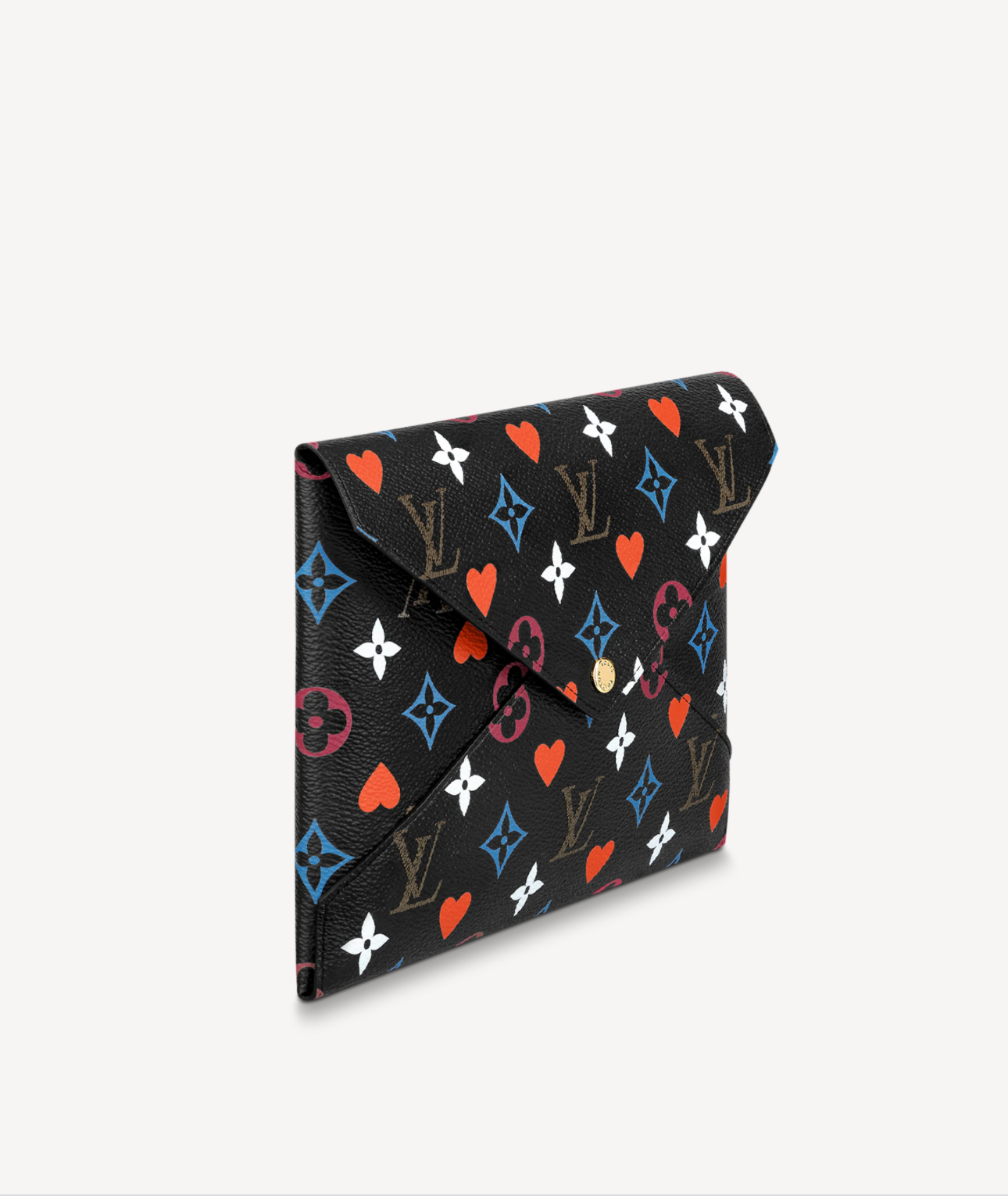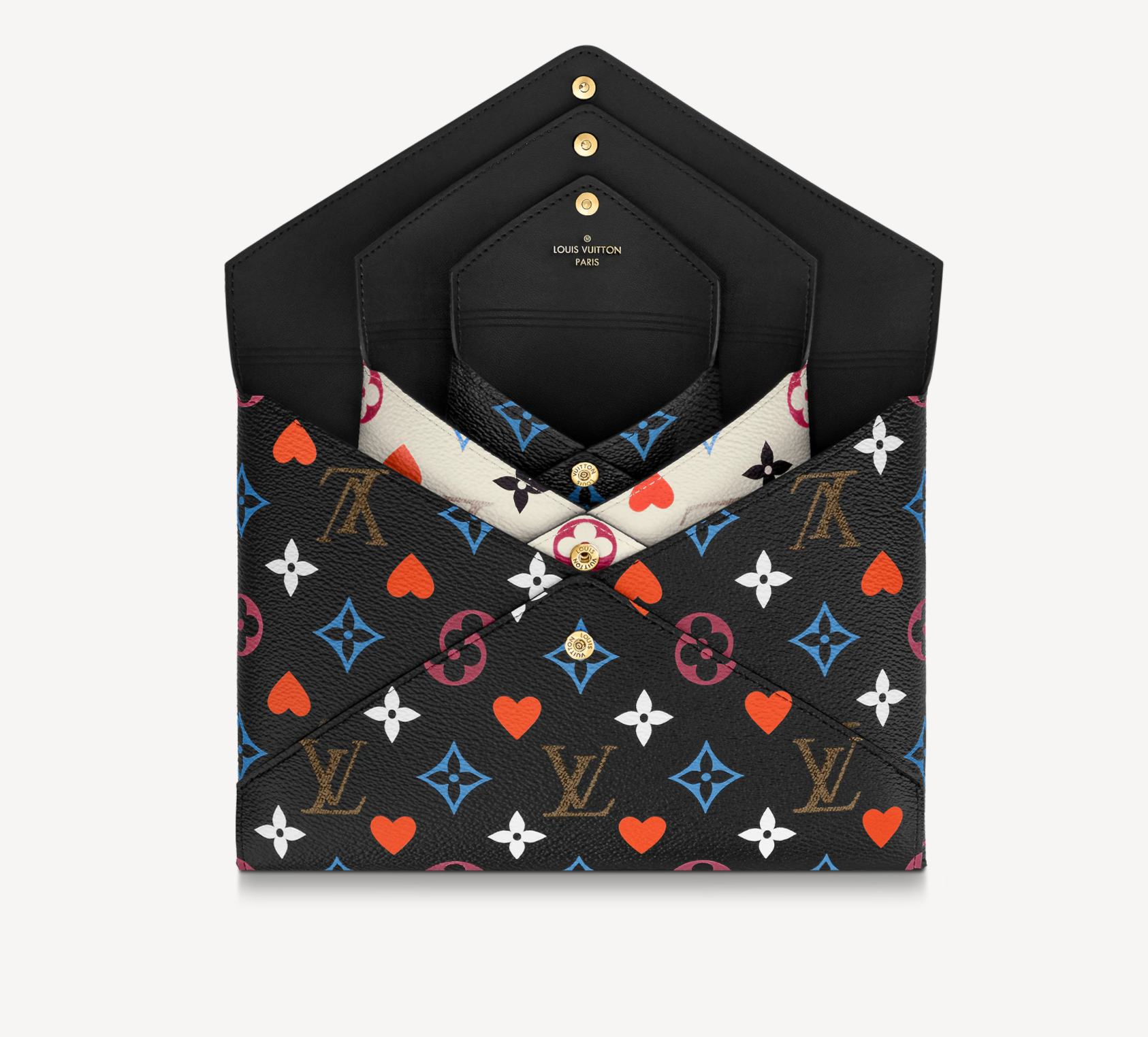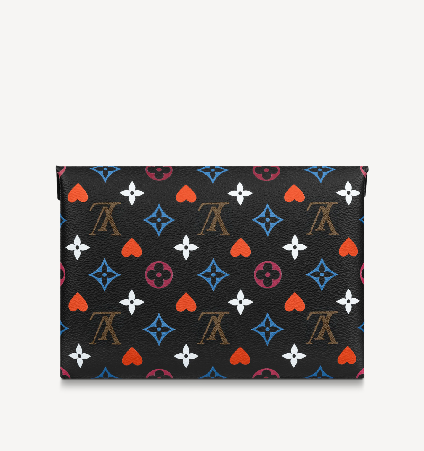 Characteristics: This edition of the Kirigami Pochette belongs to the Cruise 2021 Game On collection of accessories, shoes, leather goods and ready-to-wear. It features a daring reinterpretation of Monogram canvas by Artistic Director Nicolas Ghesquière, who was inspired by playing cards. The largest pouch holds a tablet, the medium one a passport, and the small one cards.