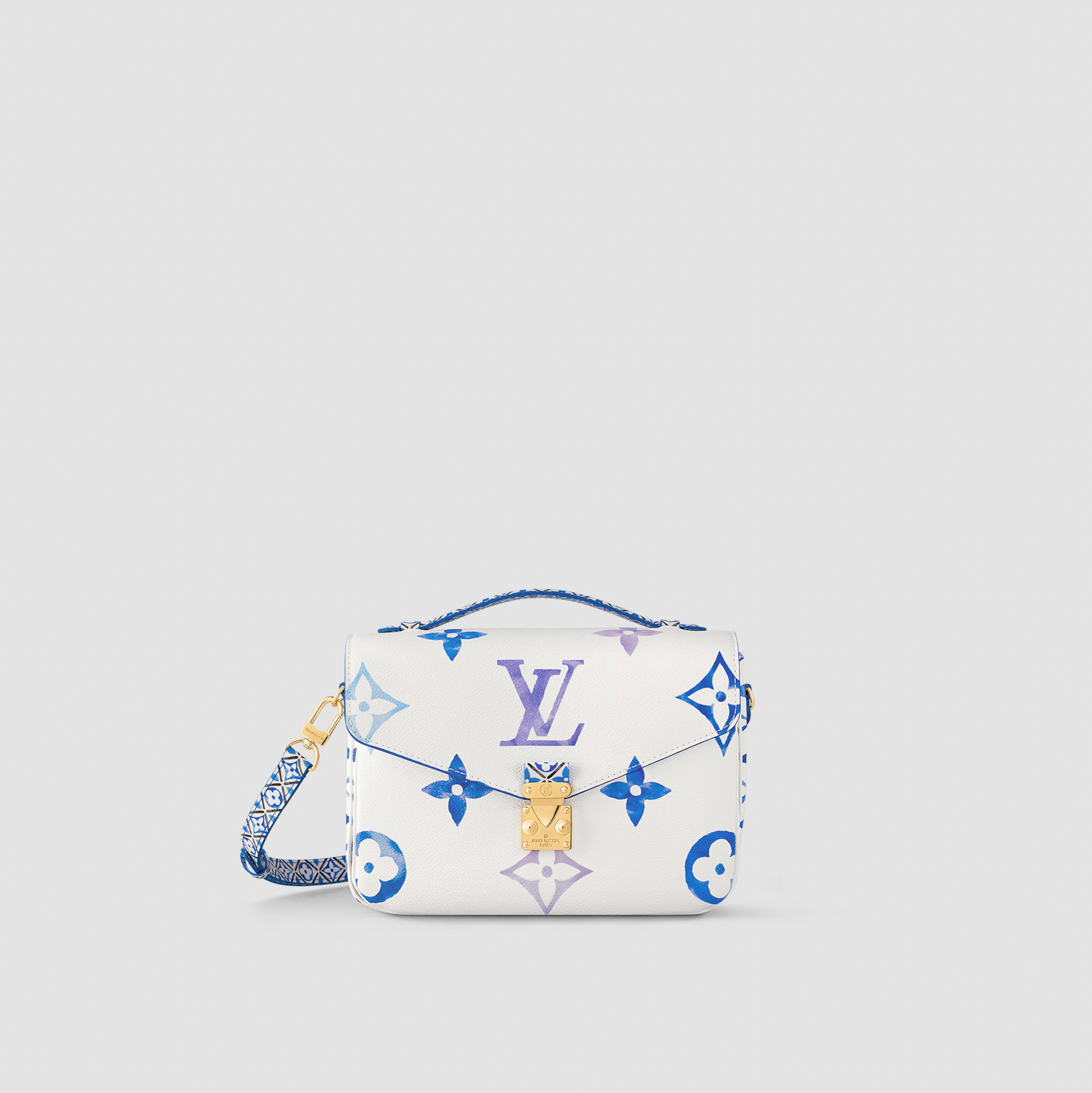 The Pochette Metis handbag is made from cream-color canvas with pastel LV’s and Monogram Flowers printed with a delicate watercolor effect. The top handle and removable strap feature a denser pattern of the Monogram Flowers, reminiscent of the painted ceramic tilework found in Lisbon.