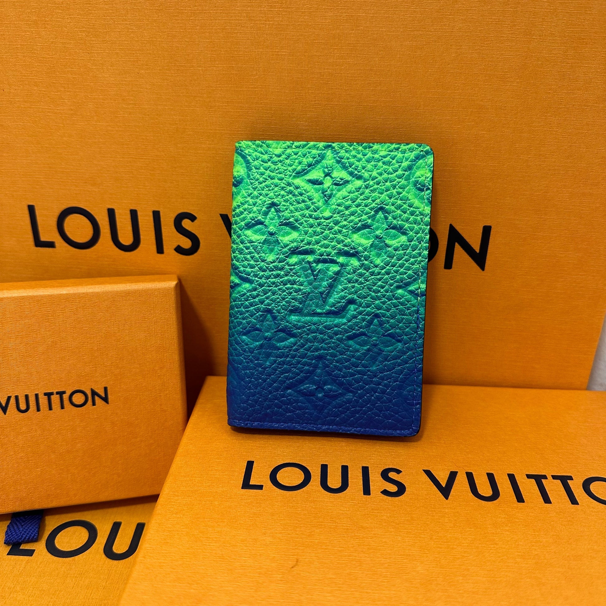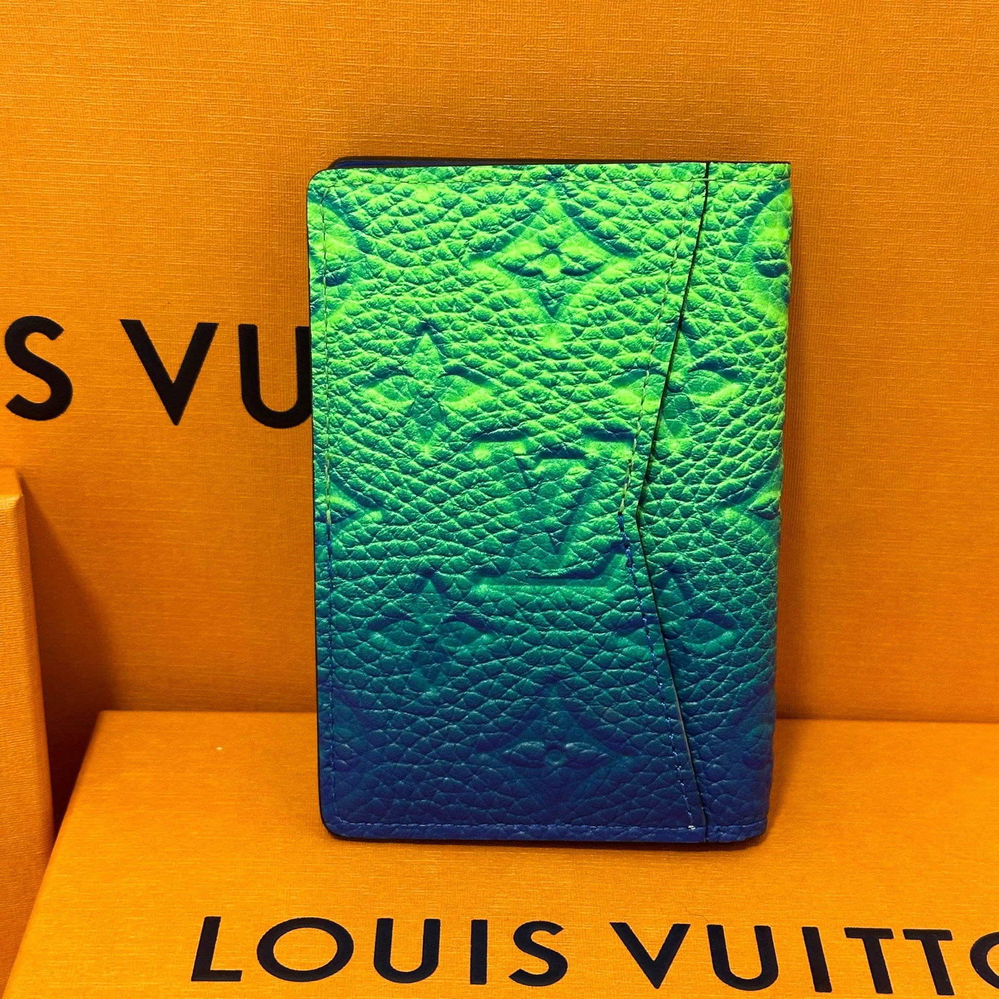Porte carte vert et bleu monogramme en cuir, une édition spéciale.