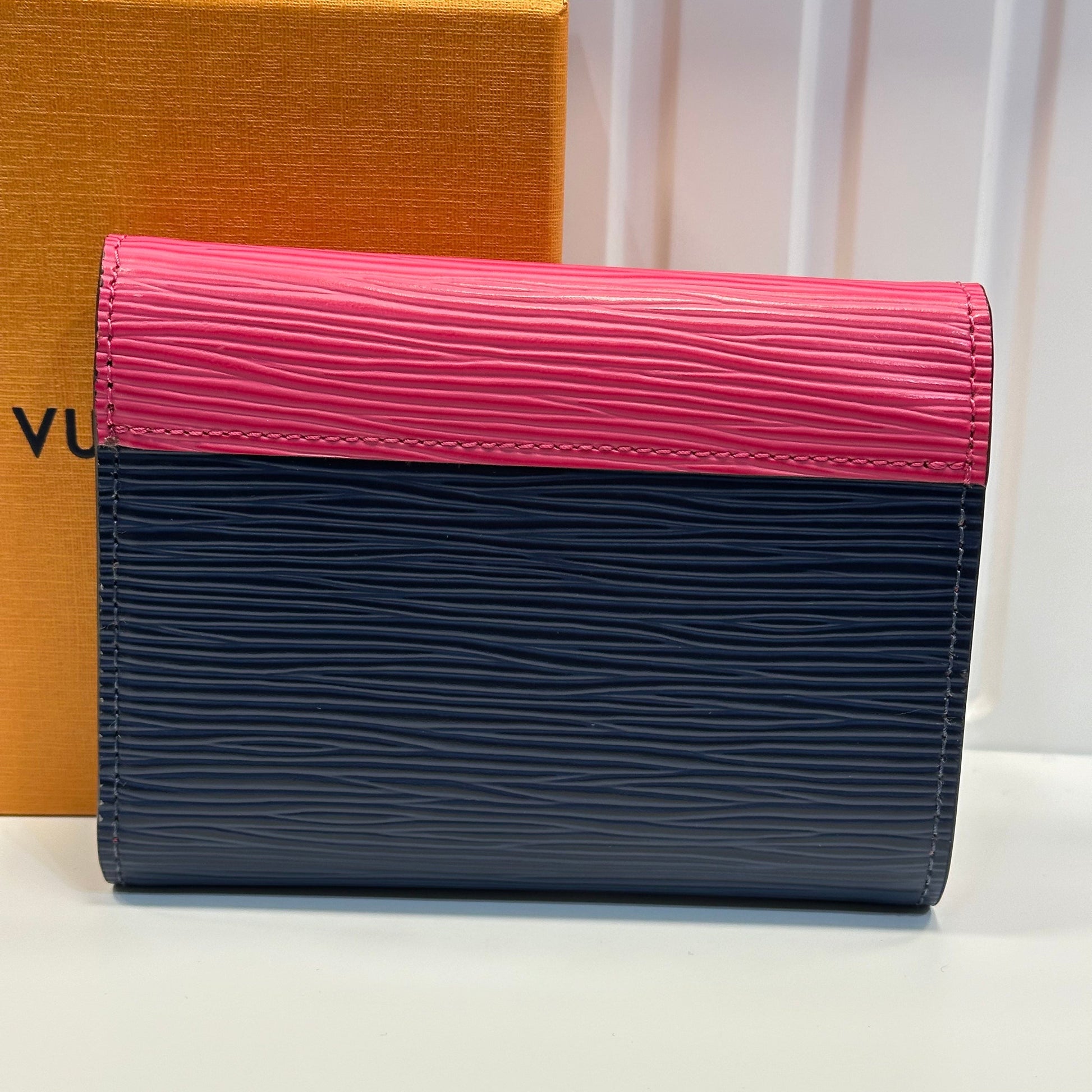 Portefeuille modèle Victorine en cuir épi bleu marine et rose, très pratique vous pouvez y mettre des cartes, des billets, des pièces.