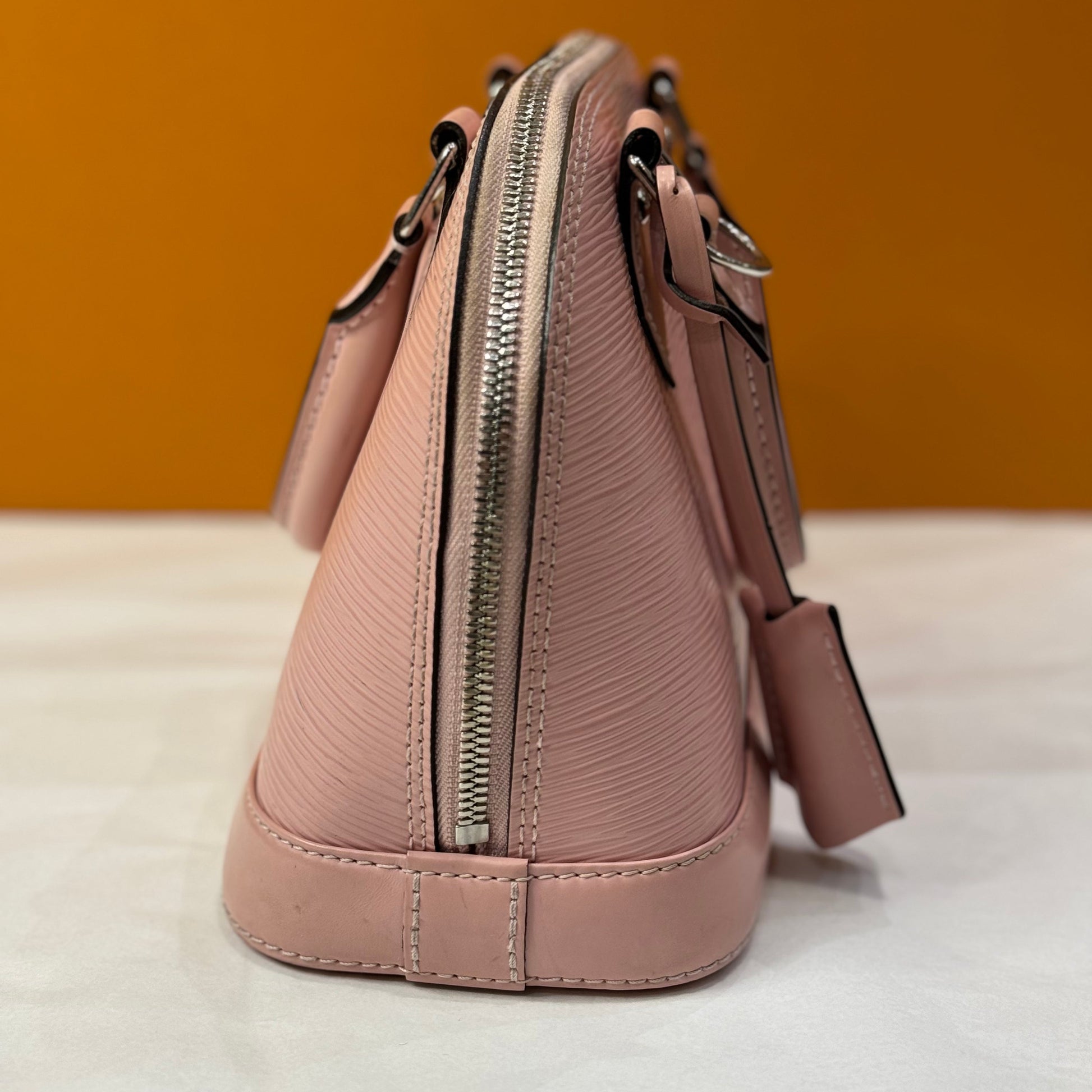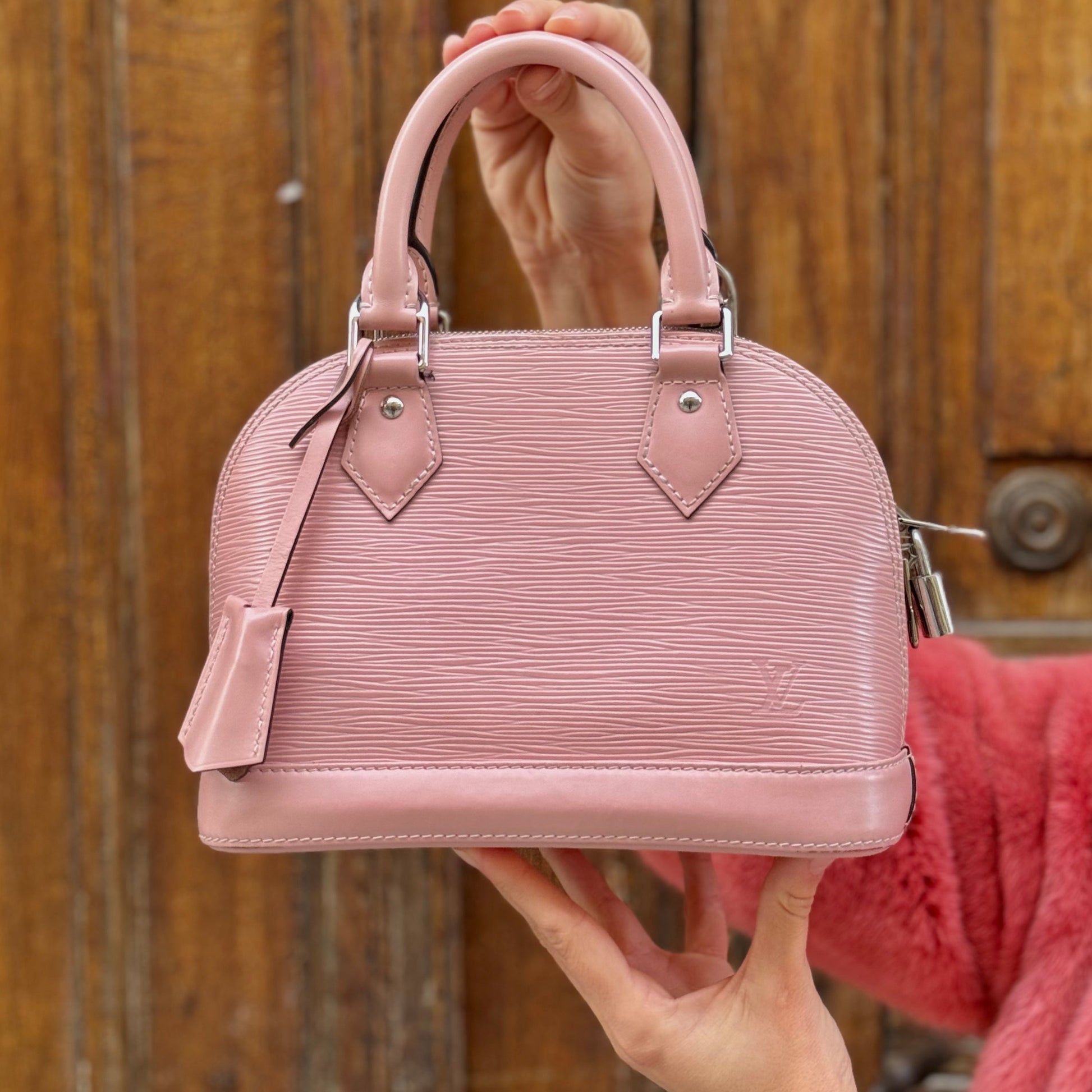 Le sac BB Alma de Louis Vuitton en cuir Épi rose Sakura est une déclaration de style et d'élégance. Cette version compacte de l'emblématique Alma incarne le raffinement associé au cuir Épi, reconnaissable à sa texture unique et à sa résistance exceptionnelle. Il offre plusieurs options de porté grâce a ses poignées supérieurs et à sa large bandoulière amovible.