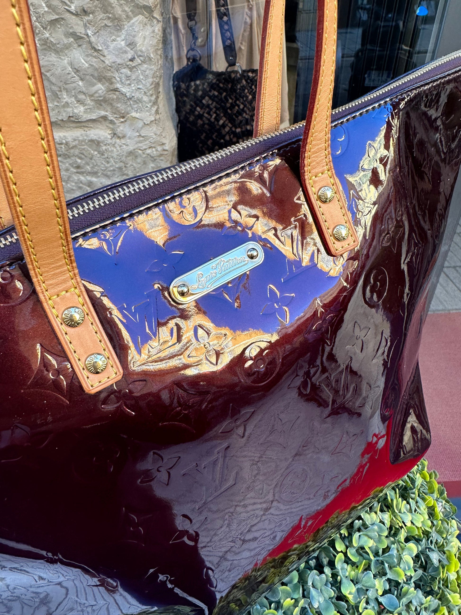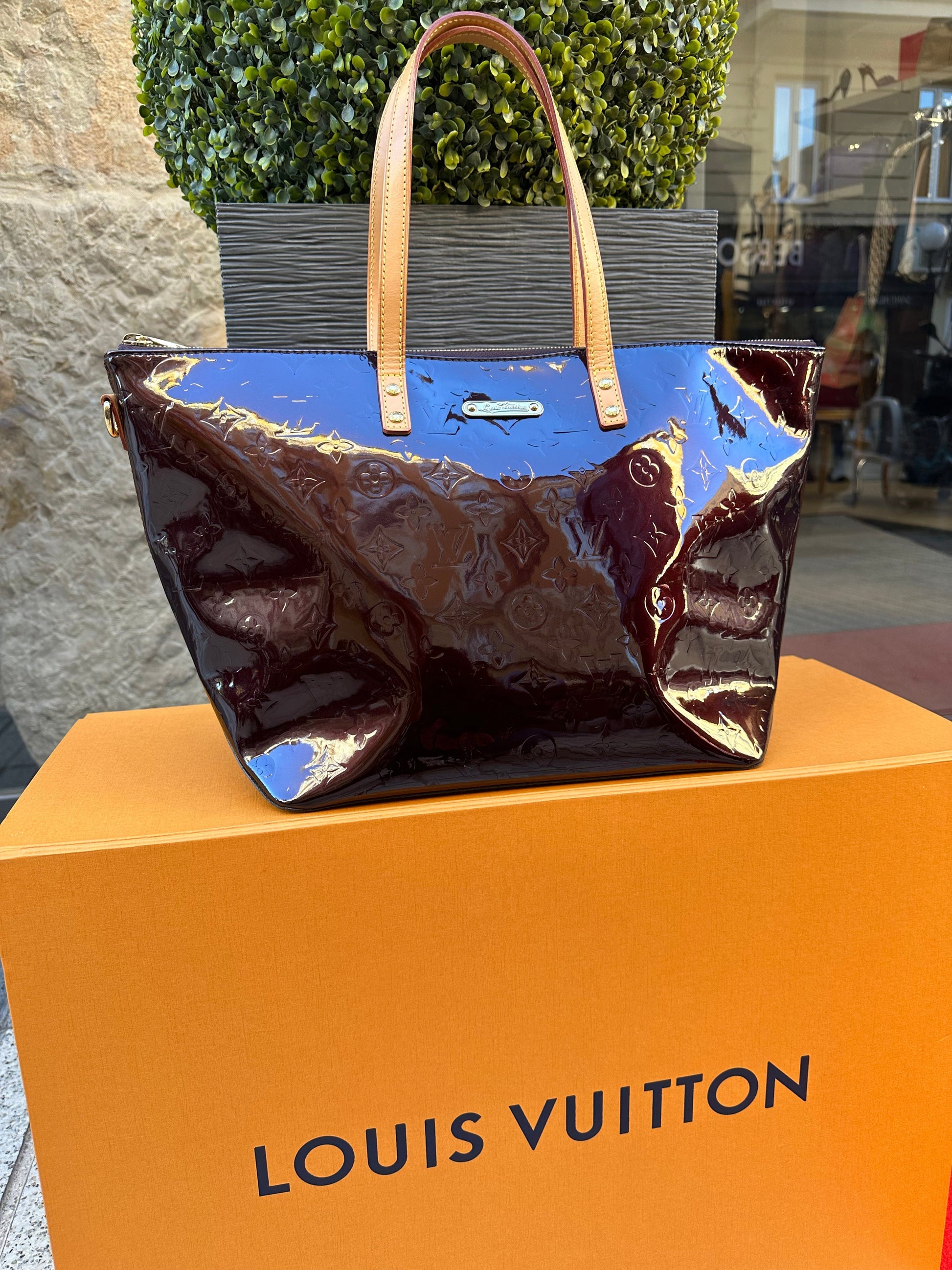 Élégant sac de la maison Louis Vuitton en cuir vernis embossé du logo LV. Les anses sont en très bon état le cuir naturel est encore très beige. Le dessous ainsi que les coins ne sont pas endommagés. A l’intérieur des poches de rangement le rendent très pratique.