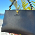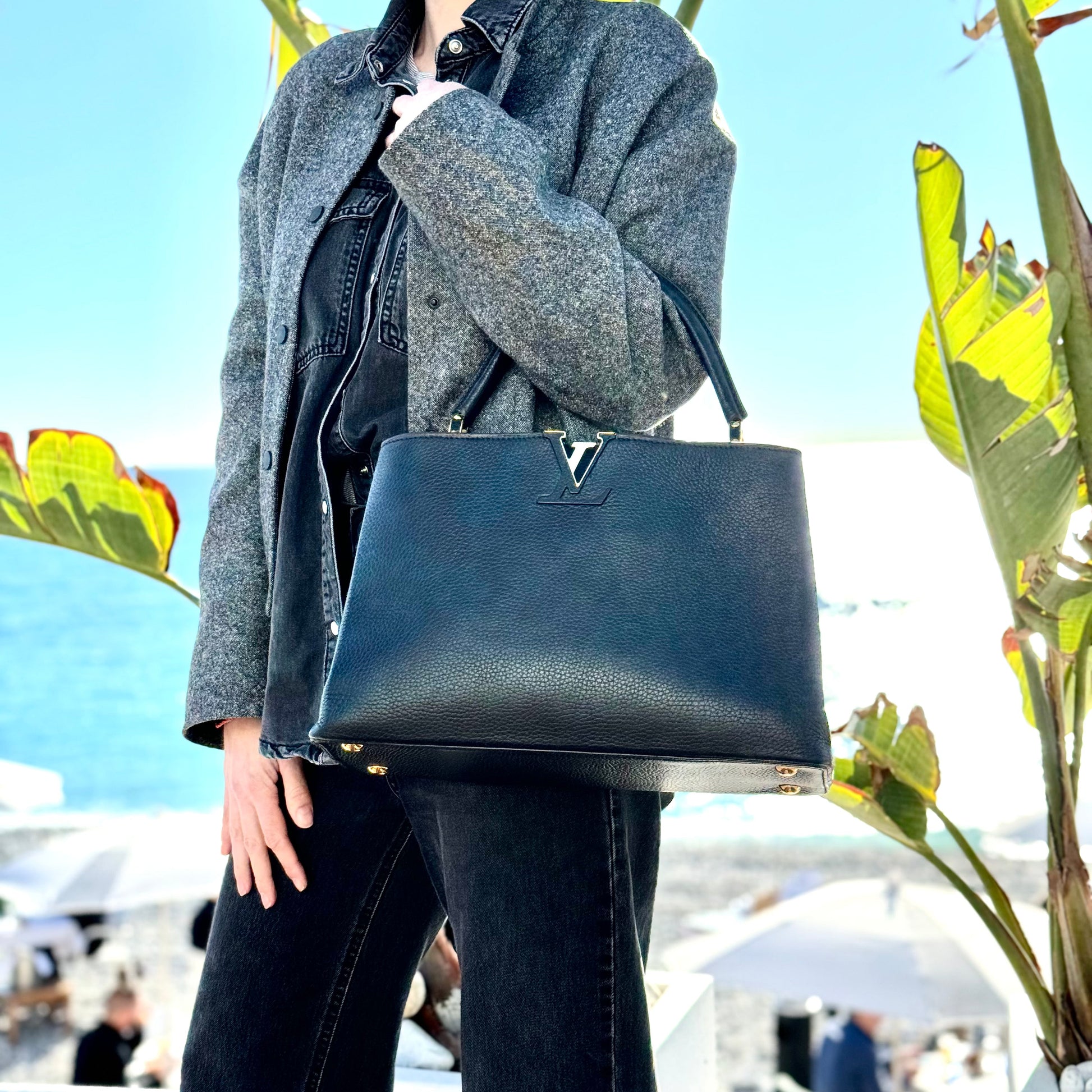 Ici présenté en version cuir grainé noir avec intérieur rose, ce sac capucine de la maison Louis Vuitton est un accessoire de choix pour celles qui recherchent l'alliance parfaite entre sophistication et élégance.