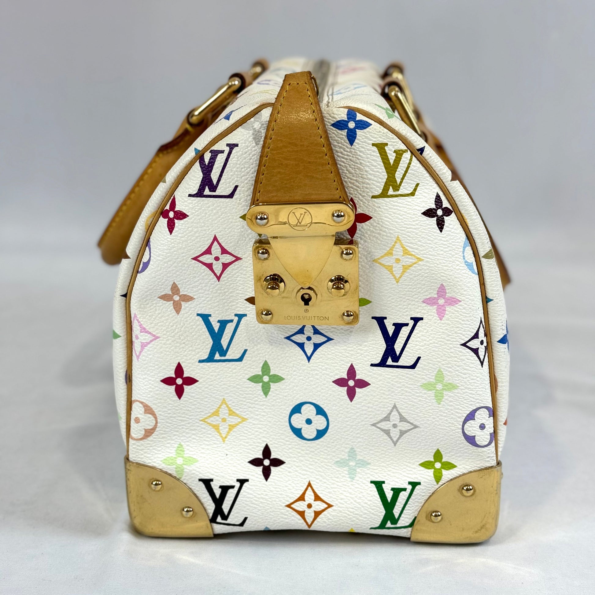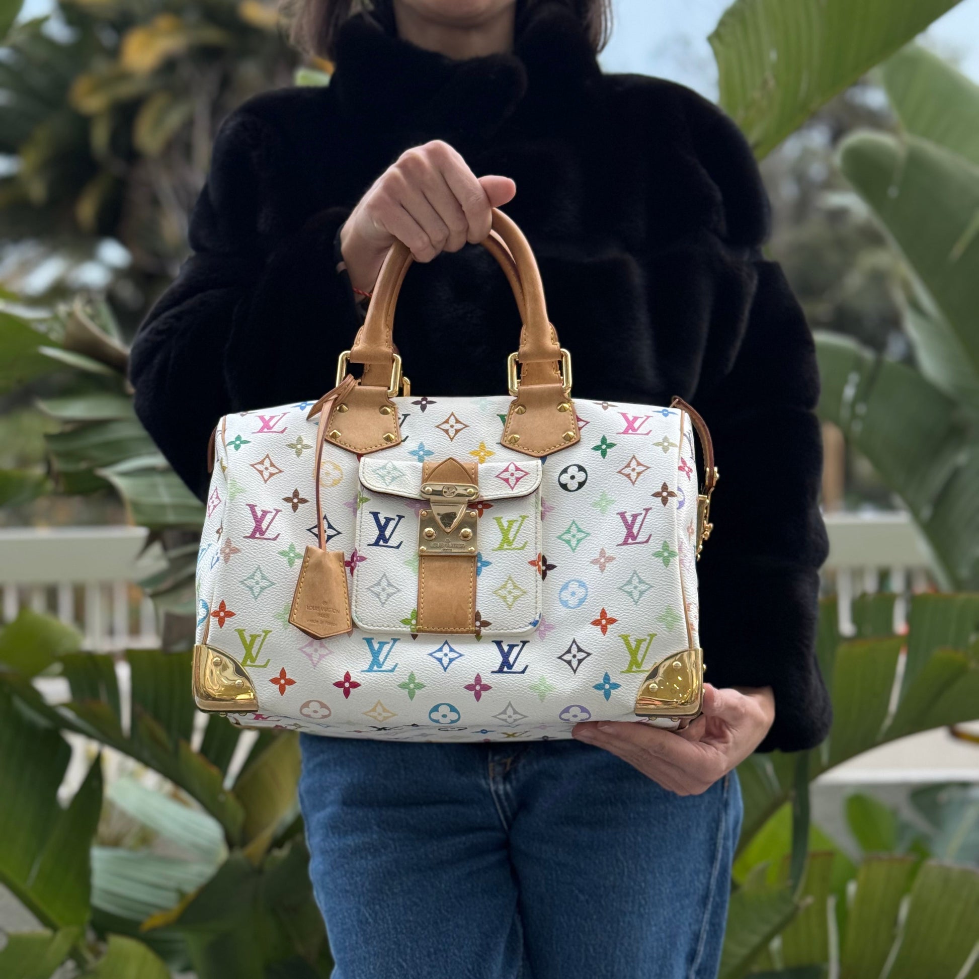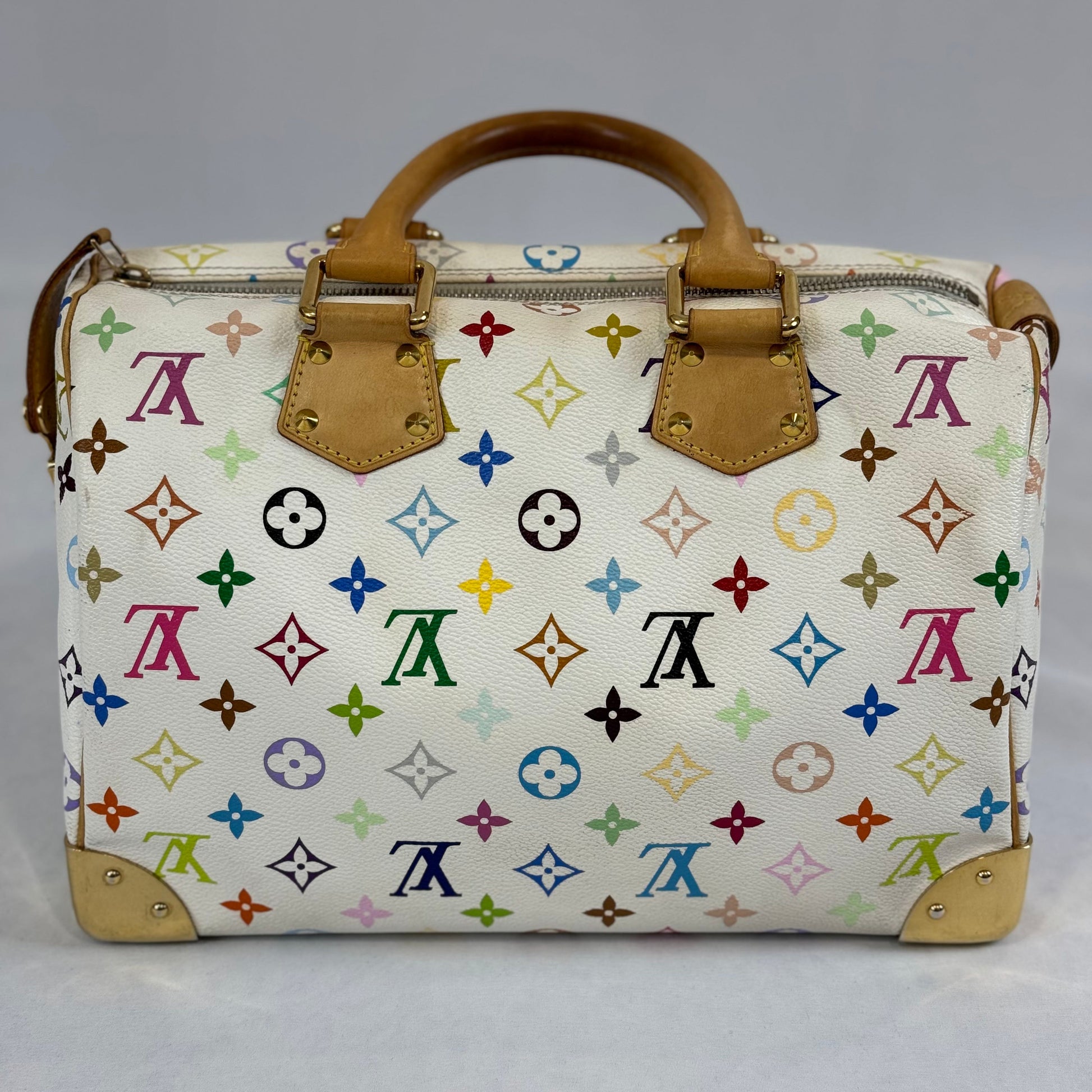 Le Speedy modèle emblématique de la maison Louis Vuitton, dans sa version toile enduite multicolore et cuir naturel.