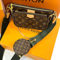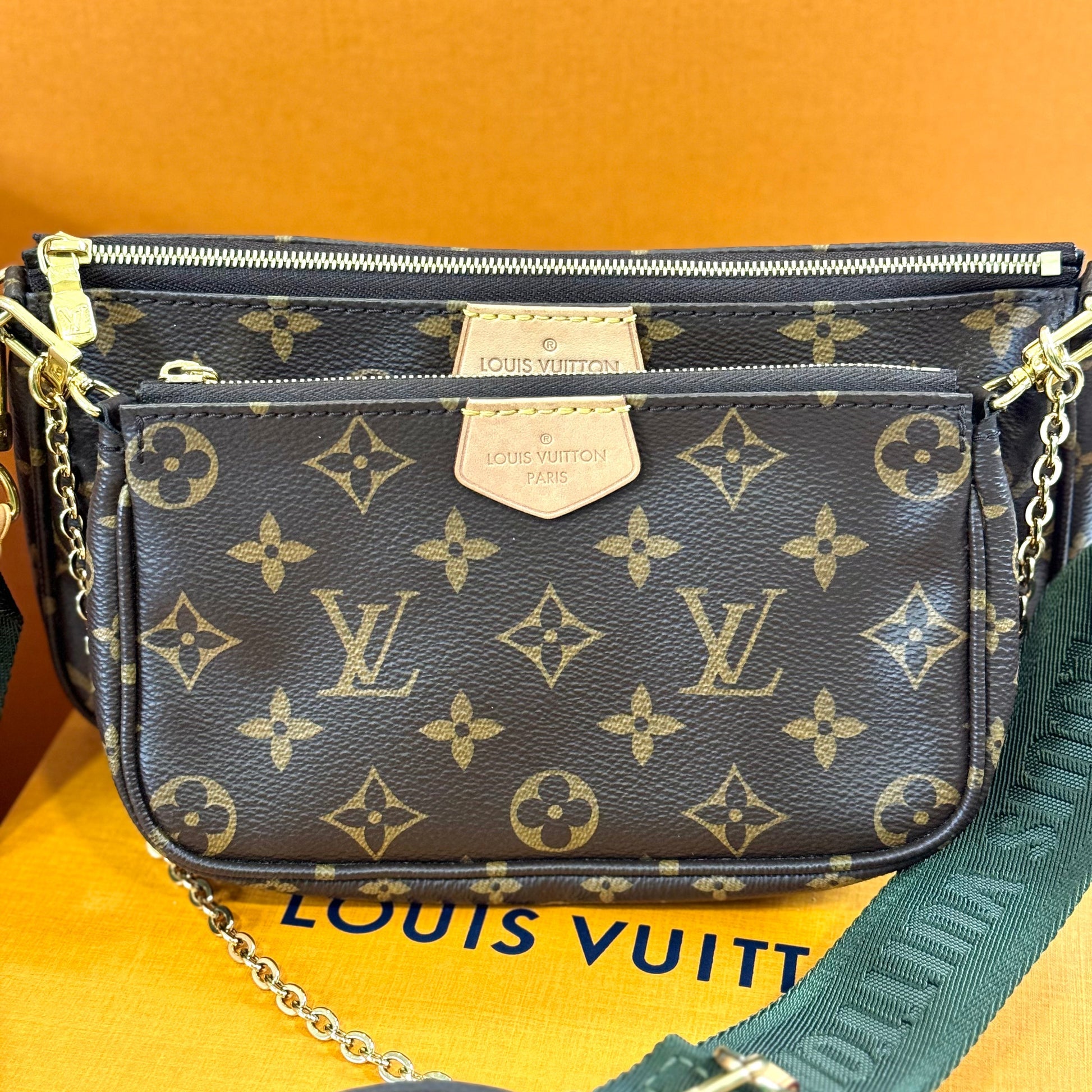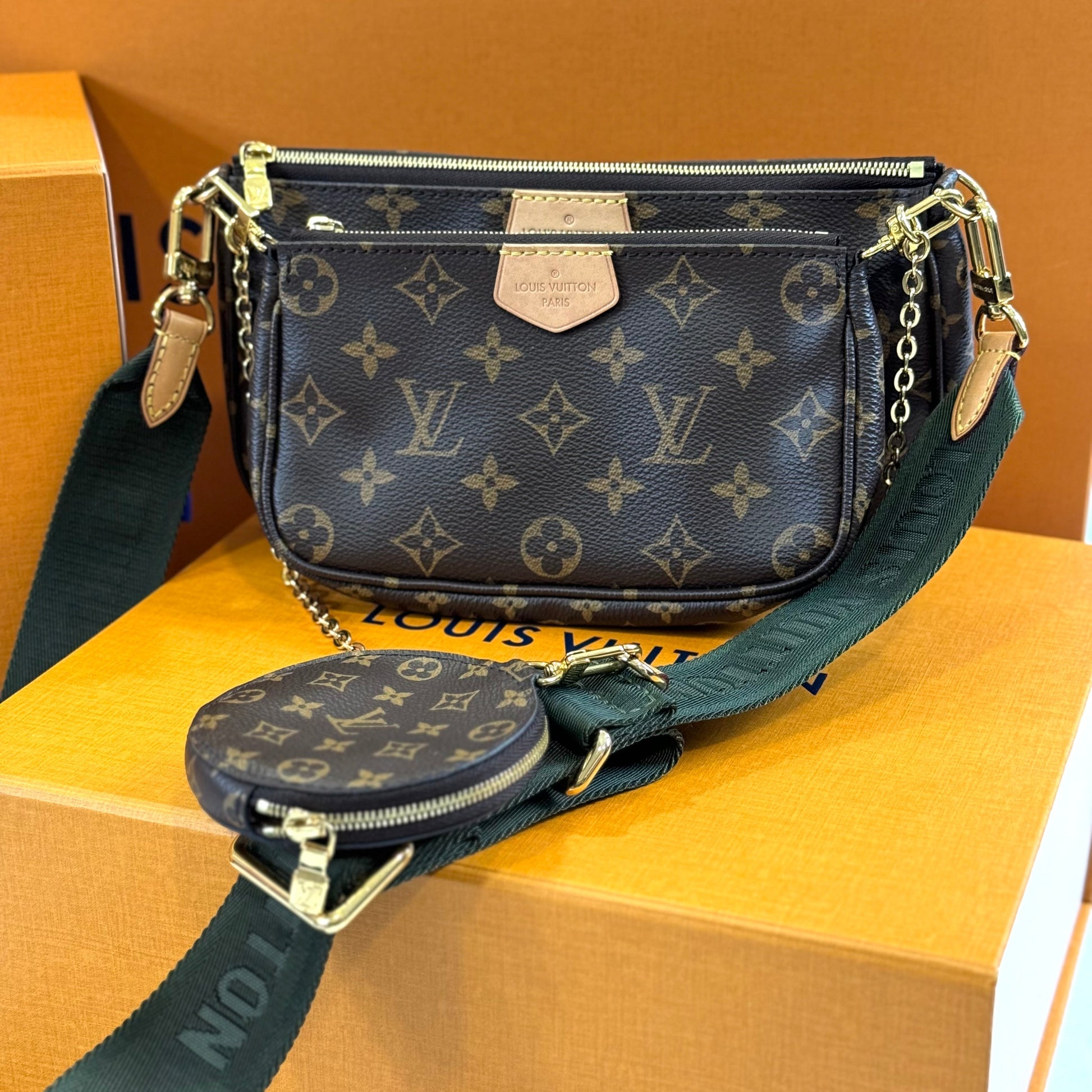 Craquez pour ce multipochette de la maison LV, en toile enduite monogrammée marron et sa bandoulière en tissu kaki avec petite pochette accessoire ronde.