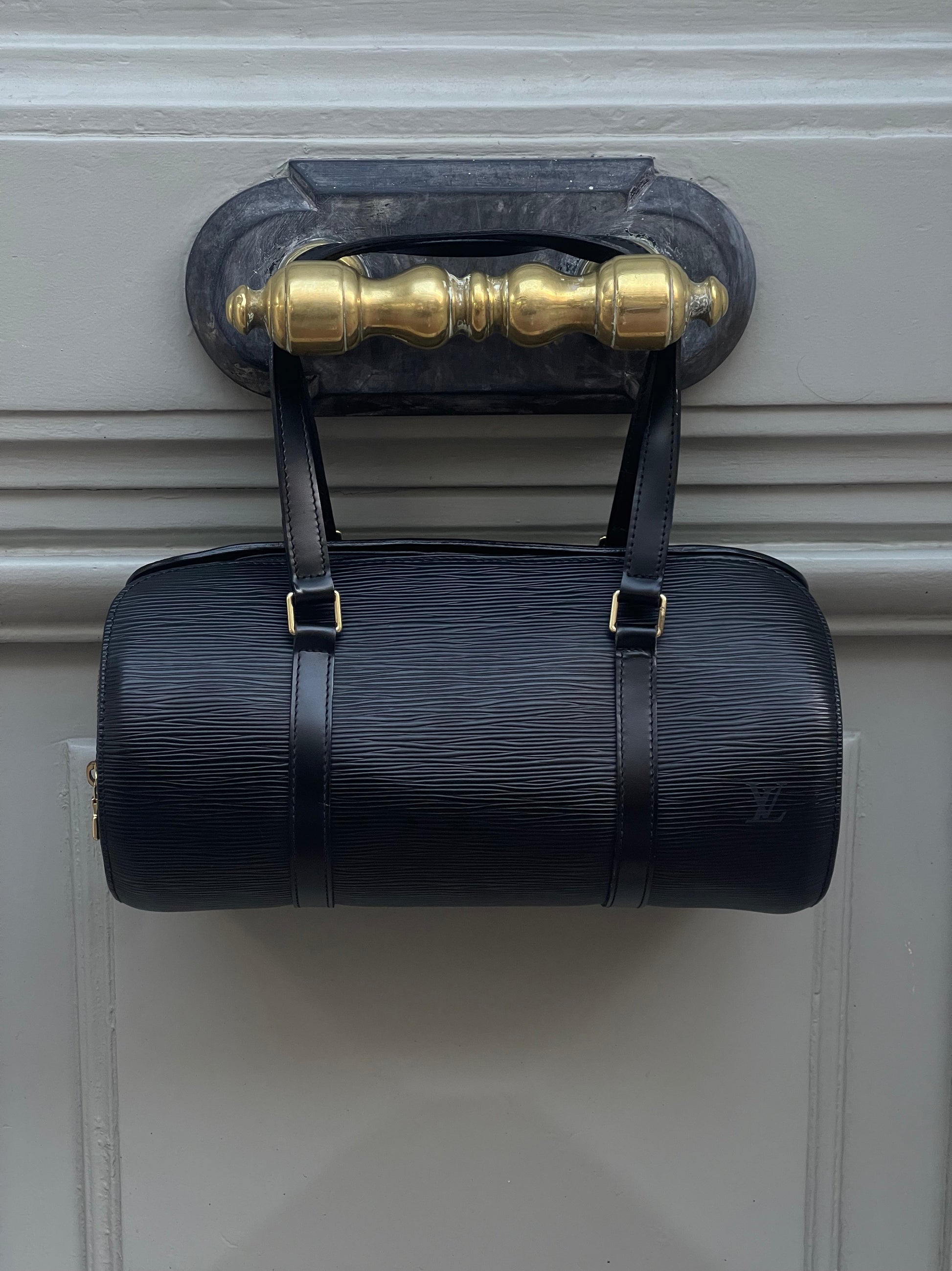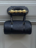 Magnifique sac Noir en cuir Épi, forme baril, logo embossé sur le devant, deux longues anses sur le dessus, avec fermeture zippée.
