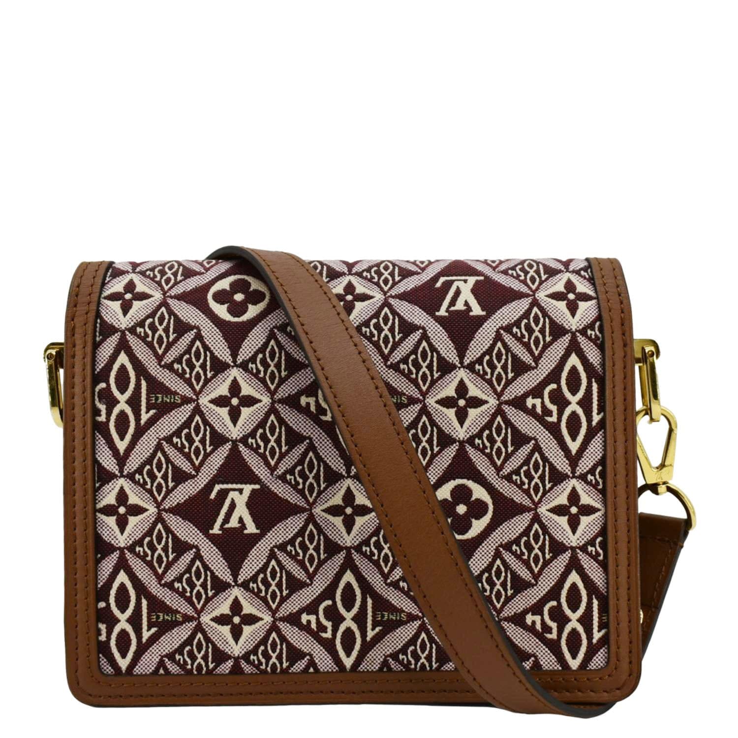 The Louis Vuitton Dauphine Mini Monogram Jacquard Since 1854 Shoulder Bag in Brown blends classic monogram motifs with the "Since 1854" jacquard pattern. This compact, elegant design offers timeless style with a modern twist, perfect for everyday or evening wear.