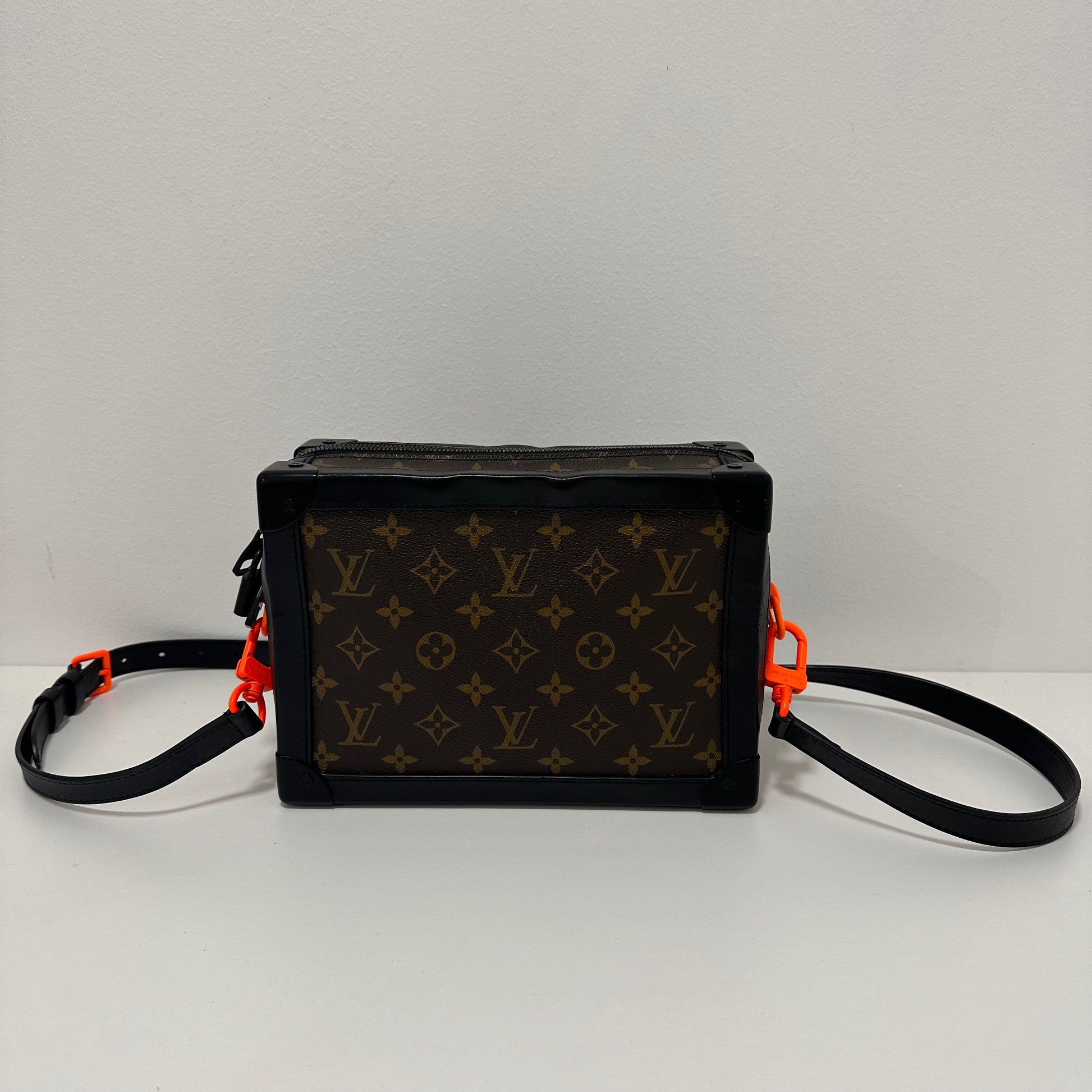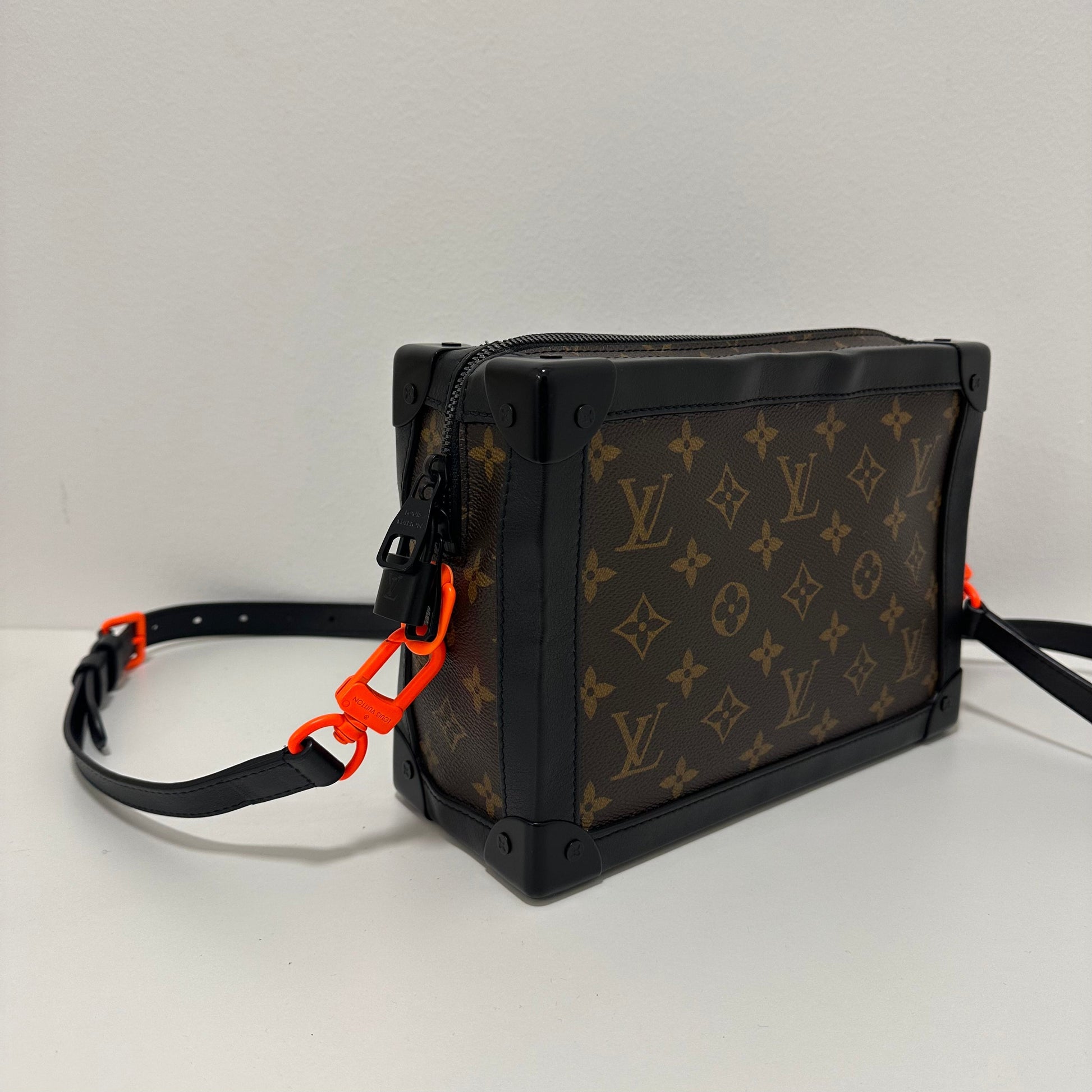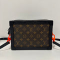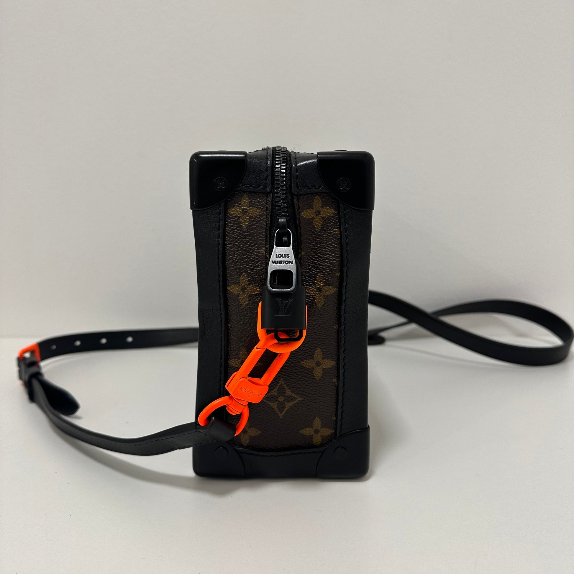 Petite malle en bandoulière en toile monogramme pour homme avec finitions en cuir noires et oranges.