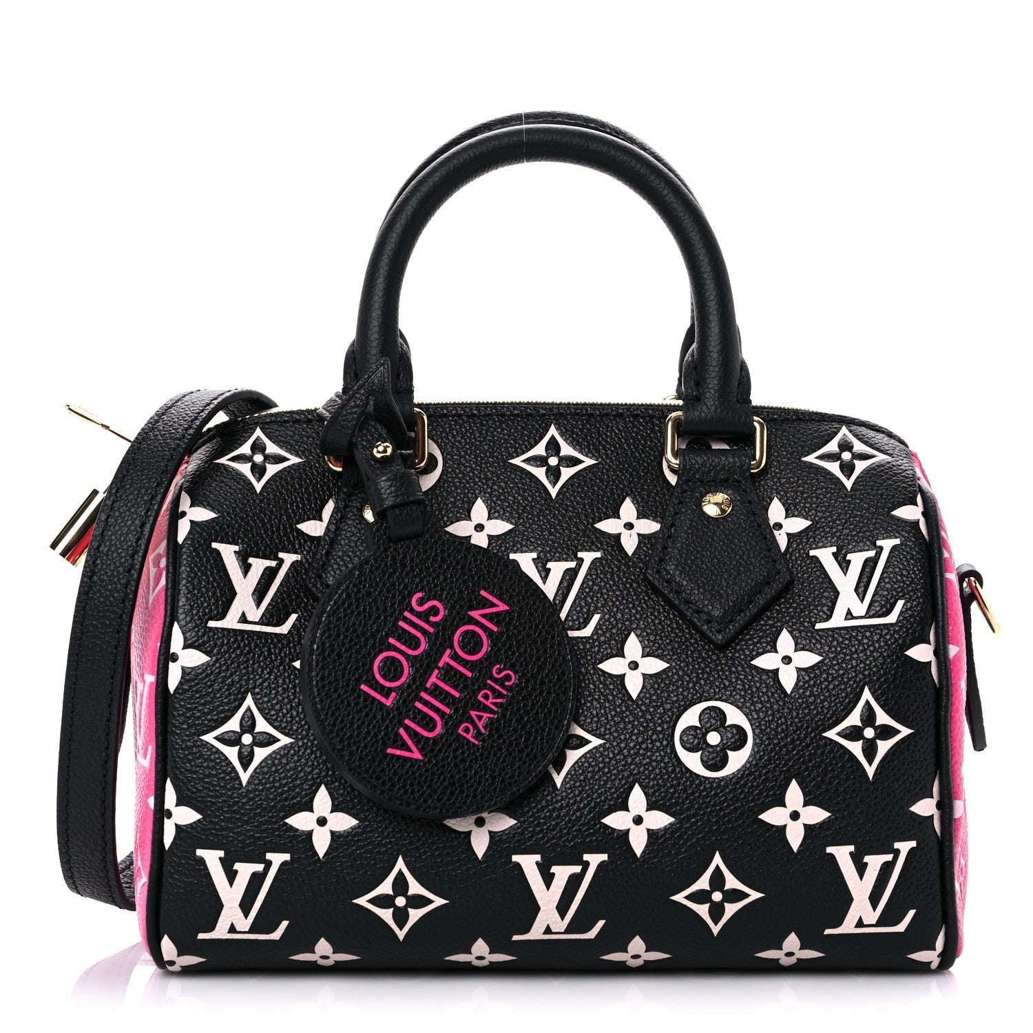 Characteristics: The Speedy Bandoulière 20 handbag looks amazing in Monogram Empreinte leather with the pattern embossed then printed on the cowhide. The distinctive design and rolled-leather top handles are clearly inspired by the House’s travel legacy. The bag’s sides are in a contrasting colored leather. It’s signed with a leather Louis Vuitton Paris name tag.
