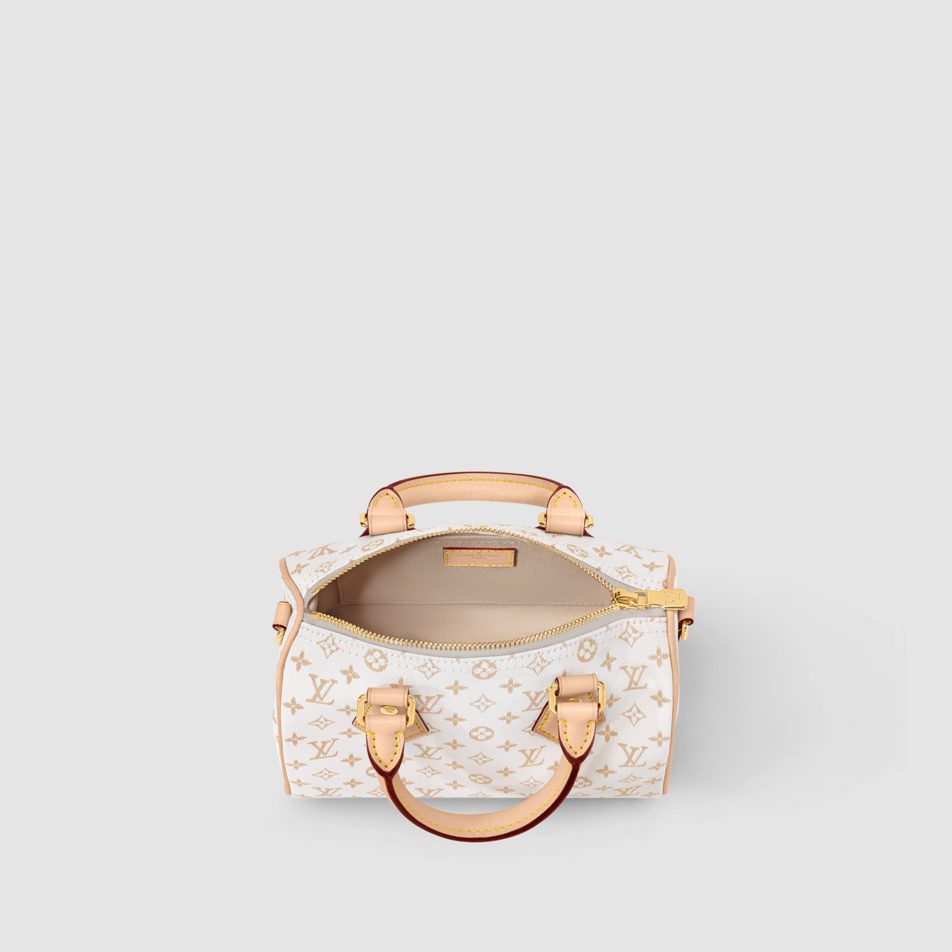 Characteristics: This Speedy Bandoulière 20 is crafted from supple polyamide, jacquard woven with the House’s latest Monogram Mini motif. The distinctive shape has two rolled-leather handles, plus a detachable and adjustable strap so it can be multiple ways. Signature details include the natural cowhide trims and gold-toned padlock, acting as markers of craftsmanship to those in the know.