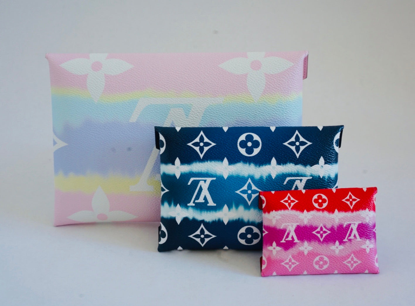 Characteristics: For Summer 2020, the Pochette Kirigami comes in a special edition belonging to the LV Escale collection of accessories and leather goods. The three envelope-style pouches in Monogram canvas are printed with a tie-dye effect in summer shades. The largest pouch will hold a tablet, the medium one a passport, and the small one cards.