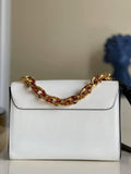 This Twist MM handbag in Epi grained leather features a LV twist-lock decorated with tortoise shell and black and white stones, a crafted detail repeated on the gold-color links of the chain. In addition to the chain, there’s a removable and adjustable strap for a more carrying options.