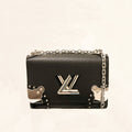 microfiber lining. It has a single flat shoulder strap, two pockets and signature LV twist-lock closure at front. The front is embellished with overstitched corners adorned with studs and metallic plates.