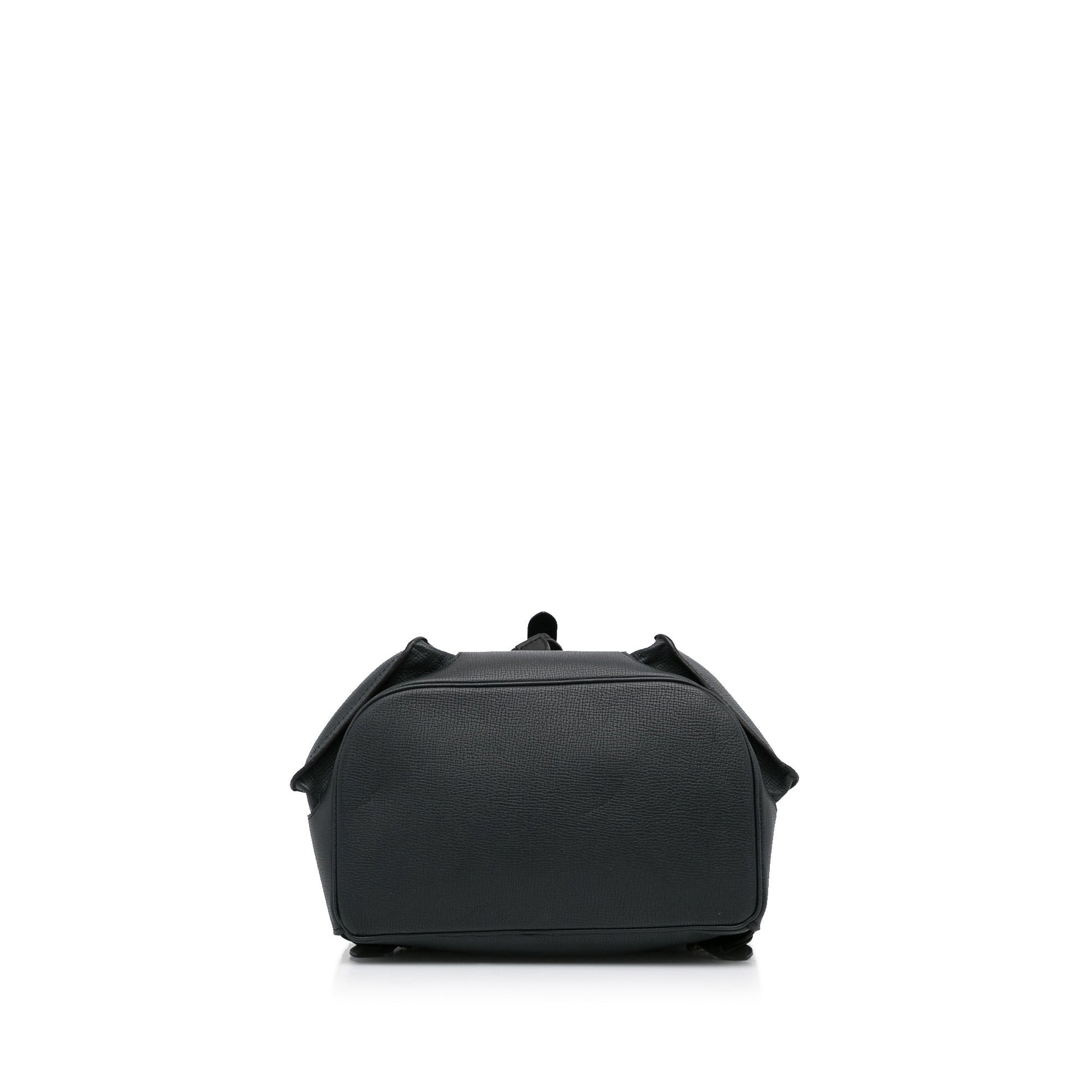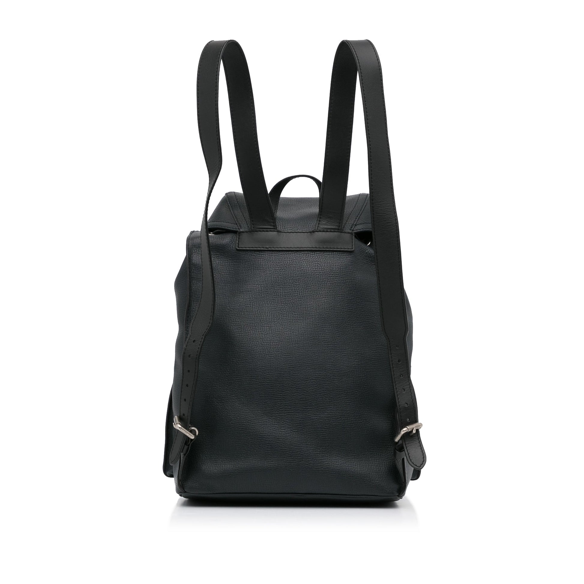 The Utah Canyon Backpack is made of leather, has a flat carry handle, adjustable flat back straps, zippered exterior pockets on the front, a flap with buckle closure, a drawstring closure and an interior compartment.