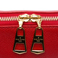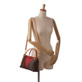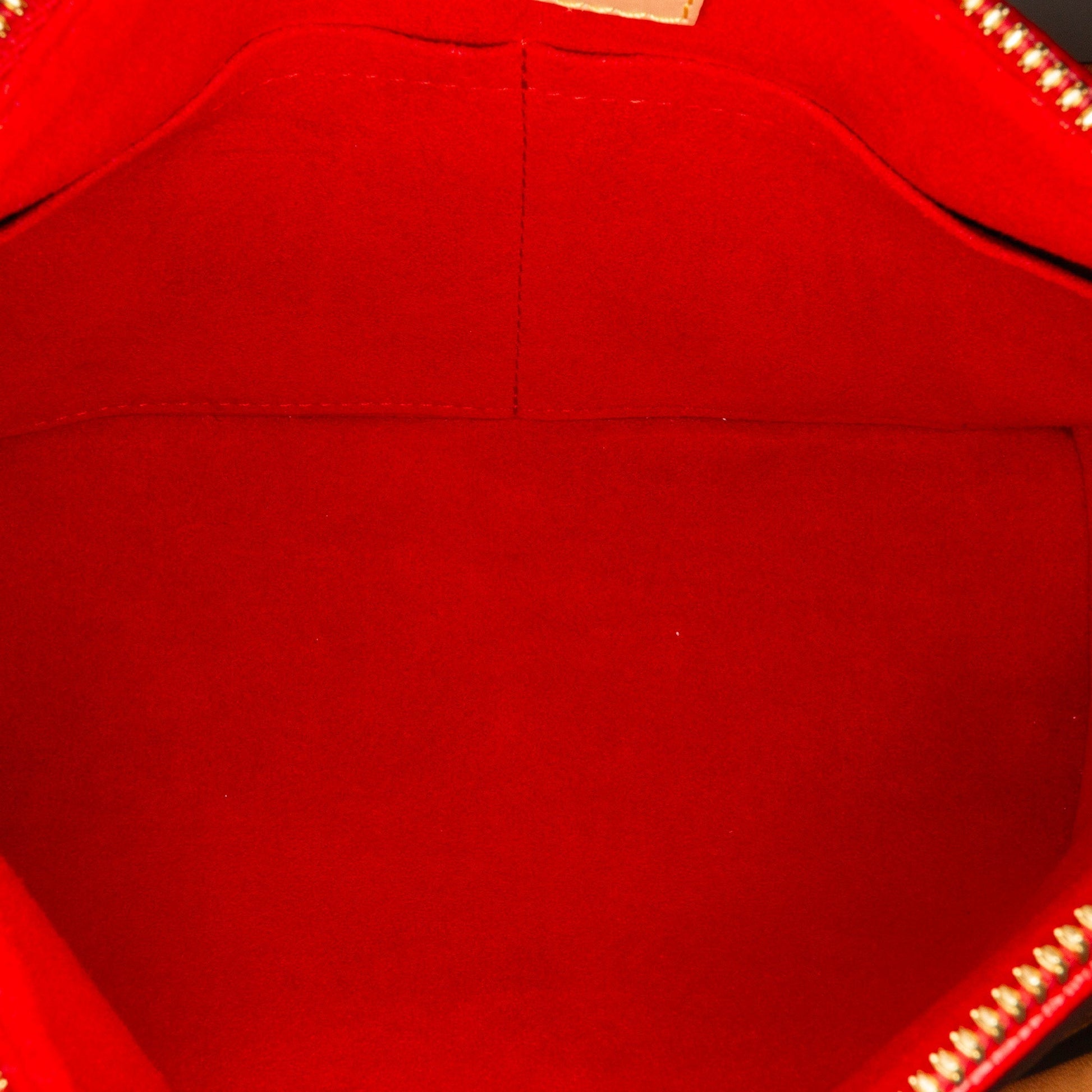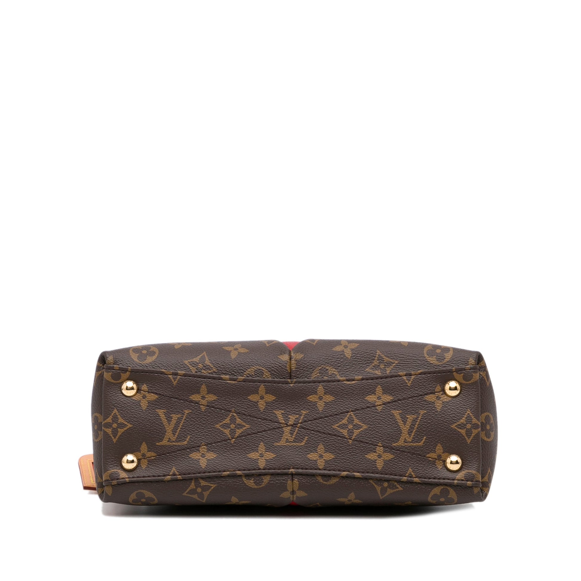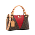 This Louis Vuitton V Tote BB has an iconic brown Monogram Canvas body with red leather. The Bag features gold-tone details, a double zipper at the top opening and slip pockets inside. The Bag can be carried in the hand or loosely over the shoulder and across the body.