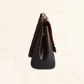 Characteristics: This iconic handbag features leather side panels, leather trim along the flap, detachable strap, and brass hardware. The flap opens opens to a red fabric interior with a zipper and patch pockets.