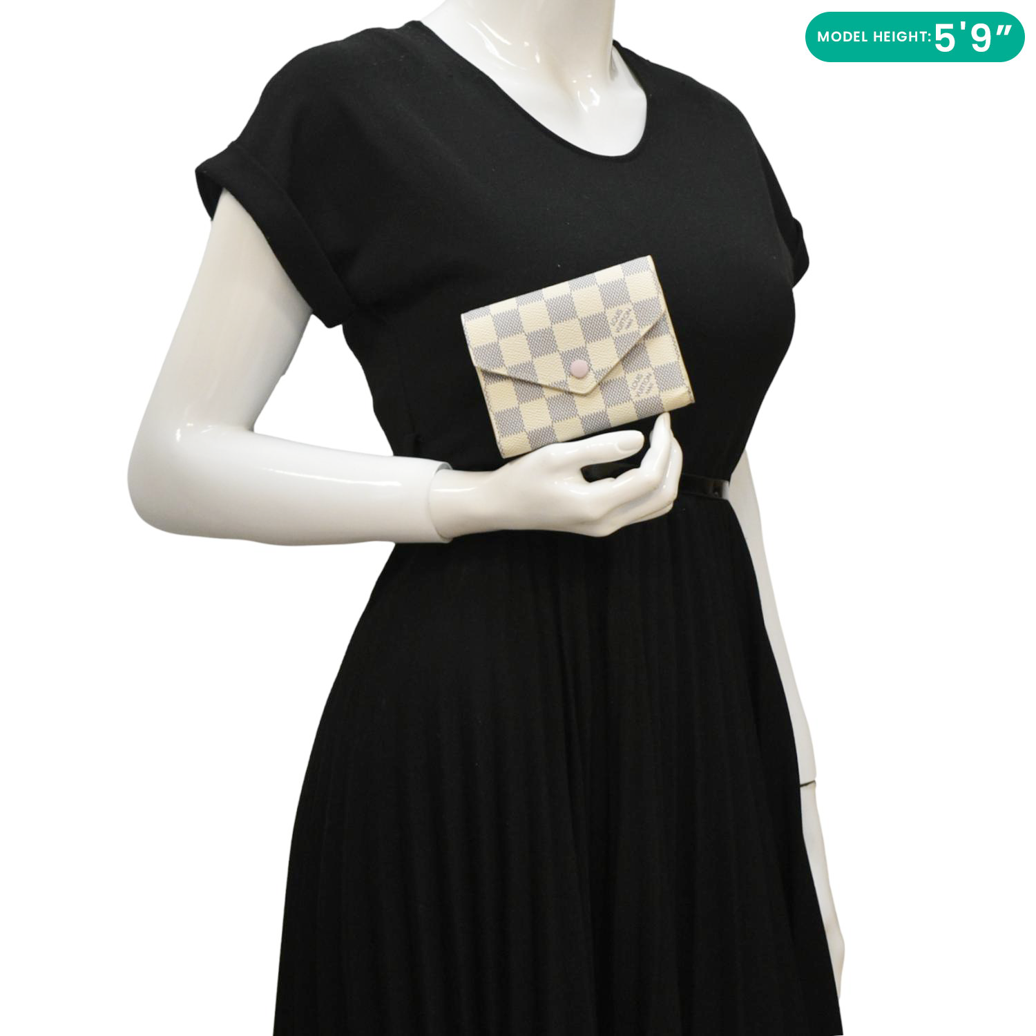 The Louis Vuitton Victorine Wallet in Damier Azur canvas with Rose Ballerine interior is a compact and stylish accessory. It features the classic checkered pattern with a soft pink interior, offering multiple card slots, a bill compartment, and a snap closure for practical elegance.