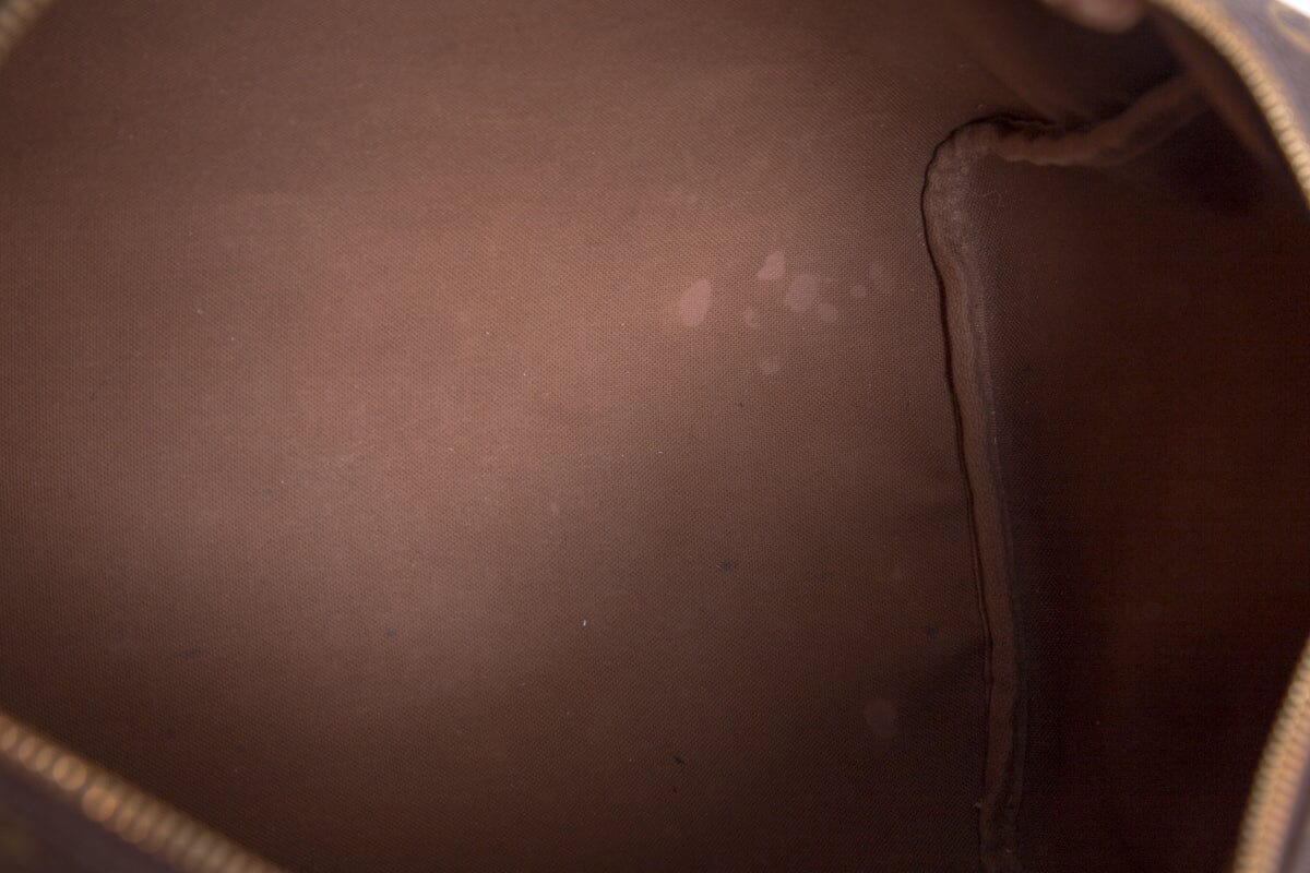 Vintage Louis Vuitton '10 Speedy Monogram Handbag. This item is in good condition; discoloring on leather details including handles and some staining on lining.