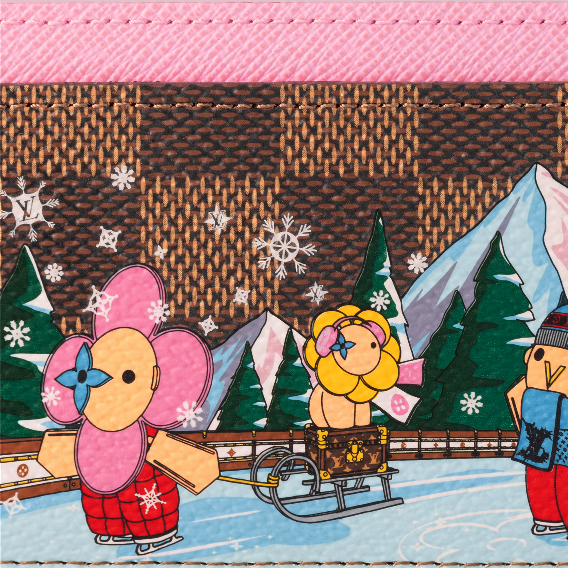 Characteristics: This limited-edition Card Holder in Damier Ebene coated canvas with pink trim sports a playful print of Vivienne, the Louis Vuitton mascot. The adventurous Vivienne is ice skating in the mountains with two friends. The wallet’s slim design contains three card slots: a large one in the center plus two on the sides.