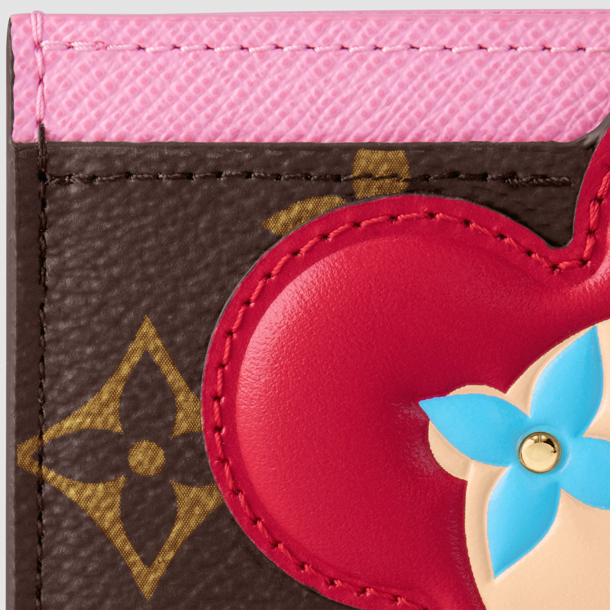 Characteristics: Fashioned from Monogram canvas with a pale pink band along the top, this Vivienne Card Holder is inspired by the colors and shapes of Vivienne, the Louis Vuitton mascot. It features leather Monogram Flowers combined in a way that evokes Vivienne’s appearance, bringing a touch of playfulness to the traditional cardholder.