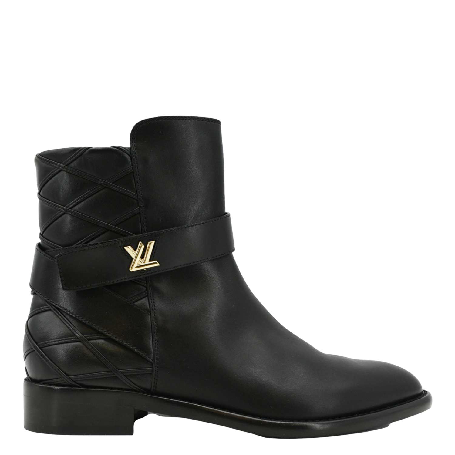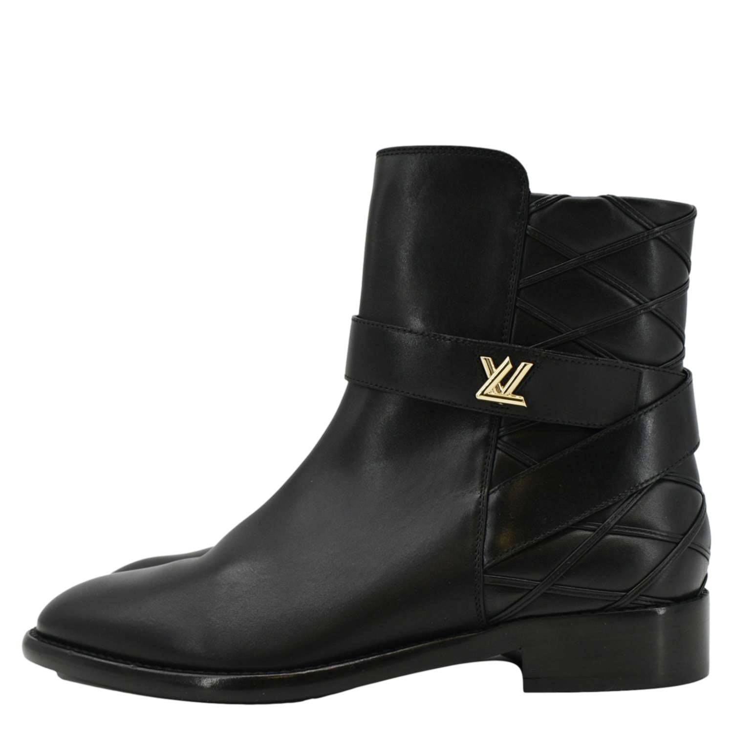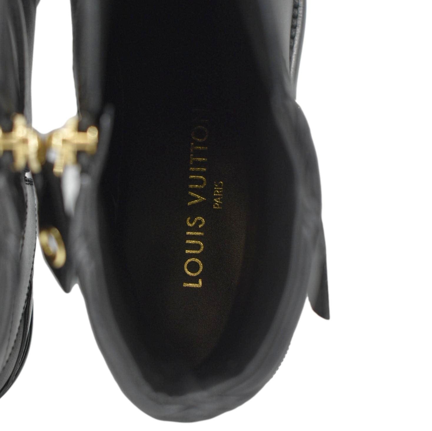 These sleek ankle boots in black leather feature a modern design with the iconic LV branding. Perfect for adding a touch of luxury to any outfit.