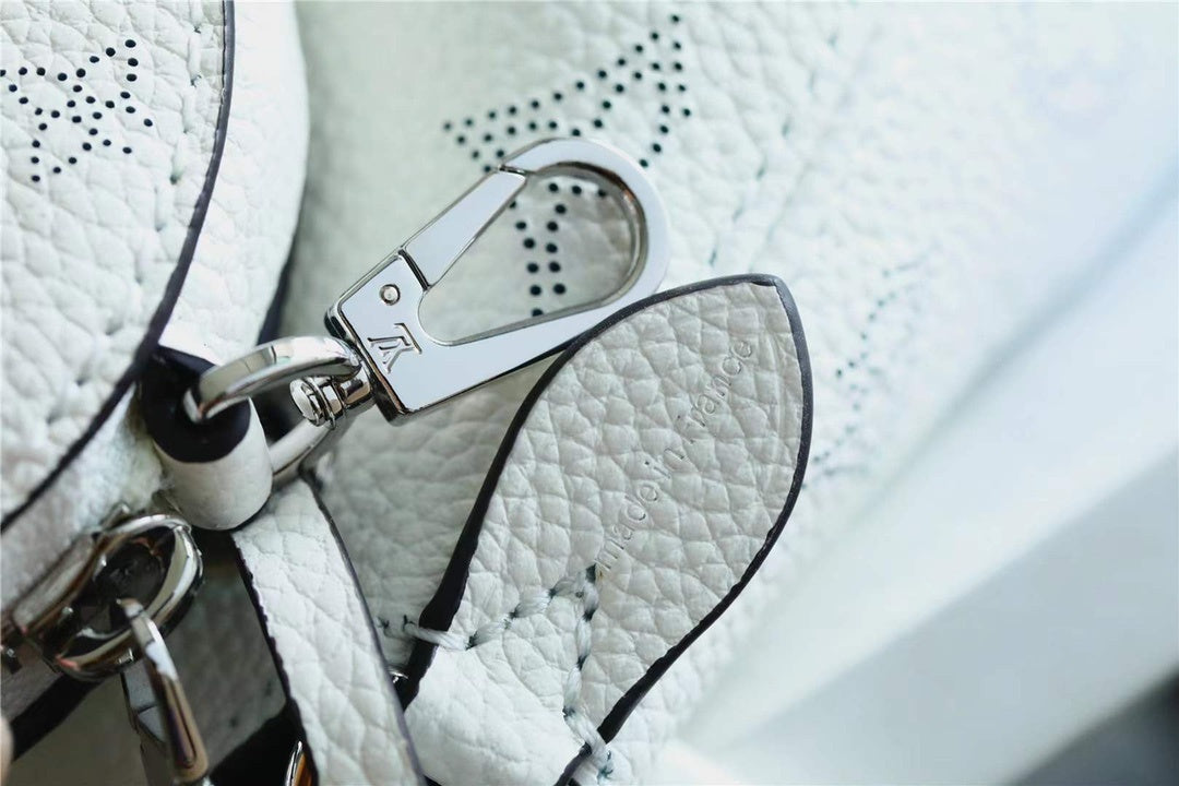 Fashioned from Mahina, the adorable Bella bucket bag includes a removable coin purse in matching Mahina. The graditlmt color of the goes from a deeper pastel tone to an almost-white at top of the bag. The perforated Monogram pattern in the Mahina and the color treatmtlmt give it a summery feel.