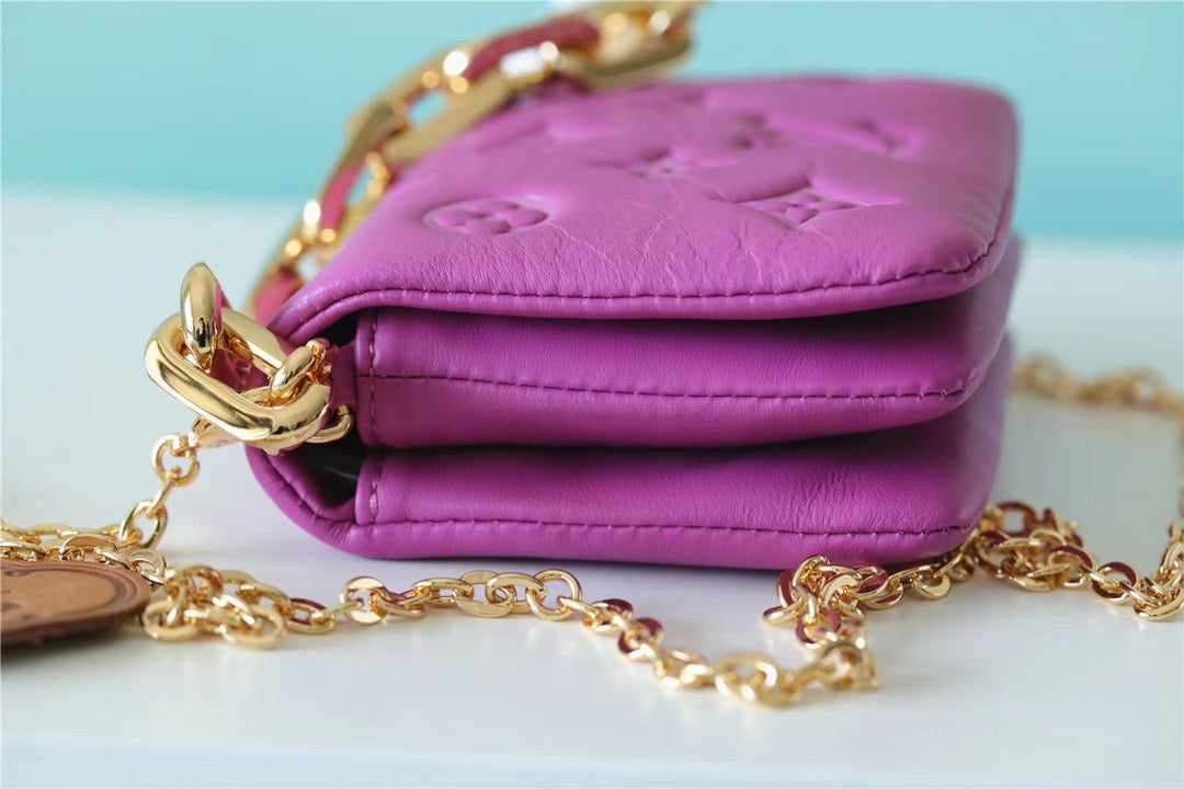 Part of L.V’s Cruise 2022 collection, the Beltbag Coussin is crafted from exceptionally soft, which is embossed with the iconic Monogram pattern, creating a puffy, cushion-like effect. This neat bag can be carried in the hand thanks to its chunky, gold-tone chain, or on the shoulder, using the longer, thinner chain.