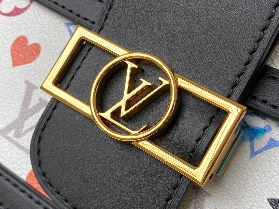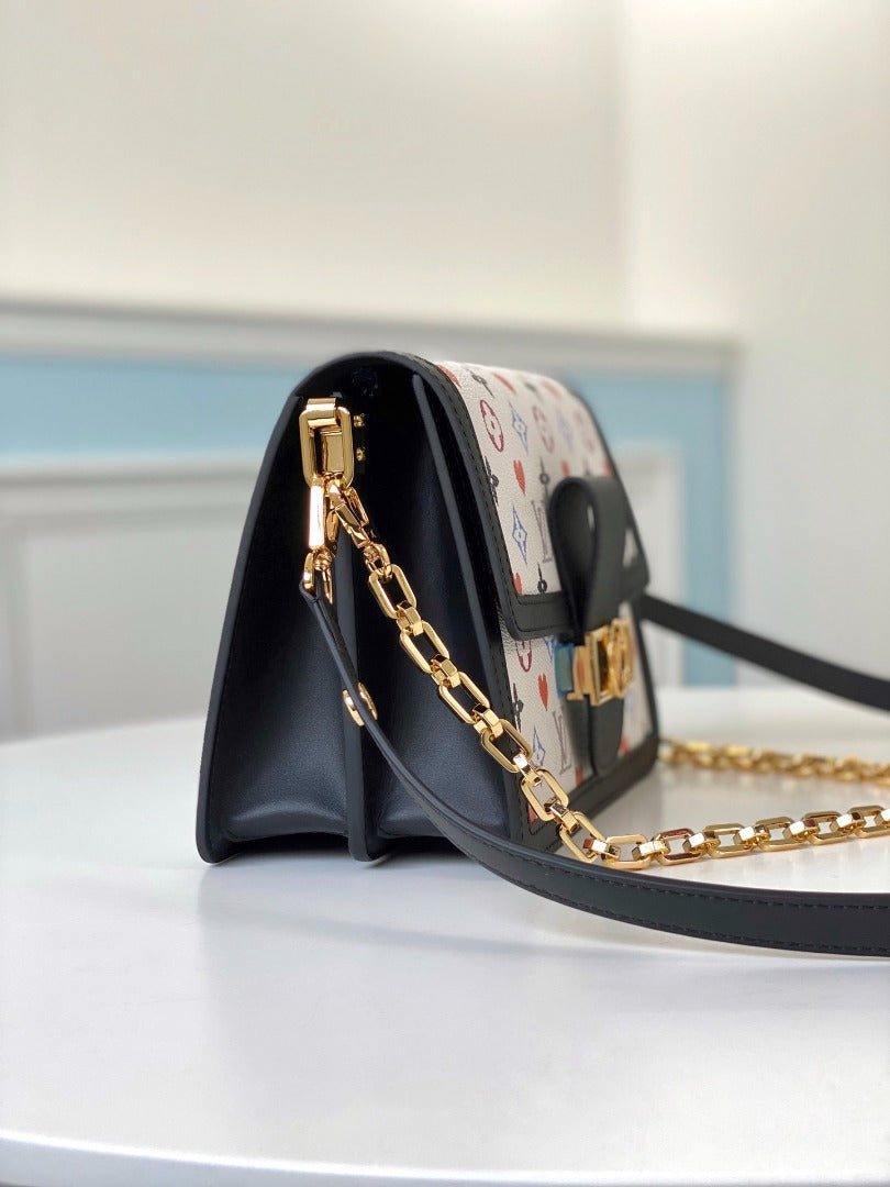In colorfully graphic Game On Monogram canvas with black trim, the structured lines of the Dauphine MM handbag are reborn for Cruise 2021. On this Monogram print some of the Monogram Flowers are replaced with red hearts. With its gold-color chain strap and signature lock, the Dauphine dresses up any outfit.