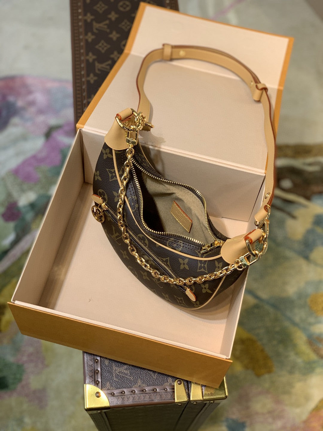 Created by Nicolas Ghesquière for the Cruise 2022 Collection, the Loop handbag is a half-moon baguette, inspired by the Croissant bag from the House archives. It has a body-fritlmdly, compact shape and a chain for shoulder carry, as well as a cross-body strap. The front zip pocket closes with a LV Circle zip pull.