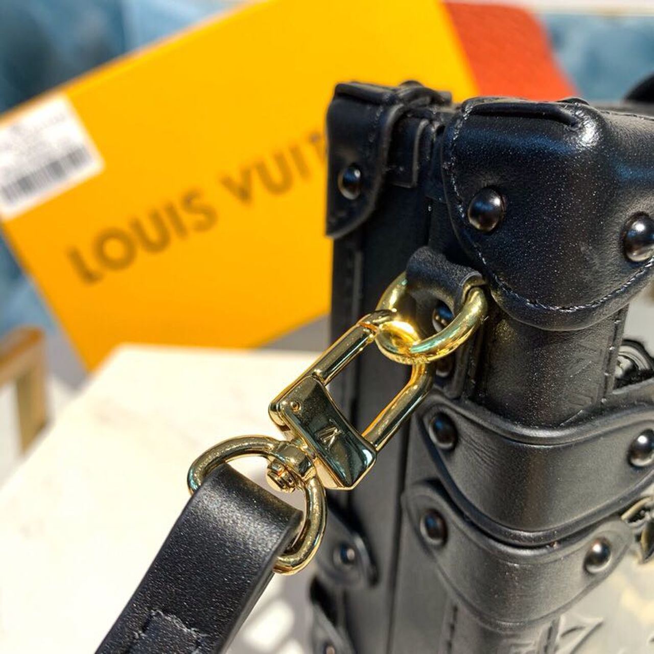 Introduced for Pre-Fall 2019, this edition of the Petite Malle is crafted from lustrous Monogram Vernis embossed patent. The covetable “little trunk” makes a glamorous statement with evening silhouettes, either carried as a clutch or worn on the removable strap. The drop can be adjusted for shoulder or cross-body wear.