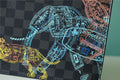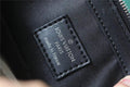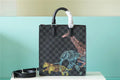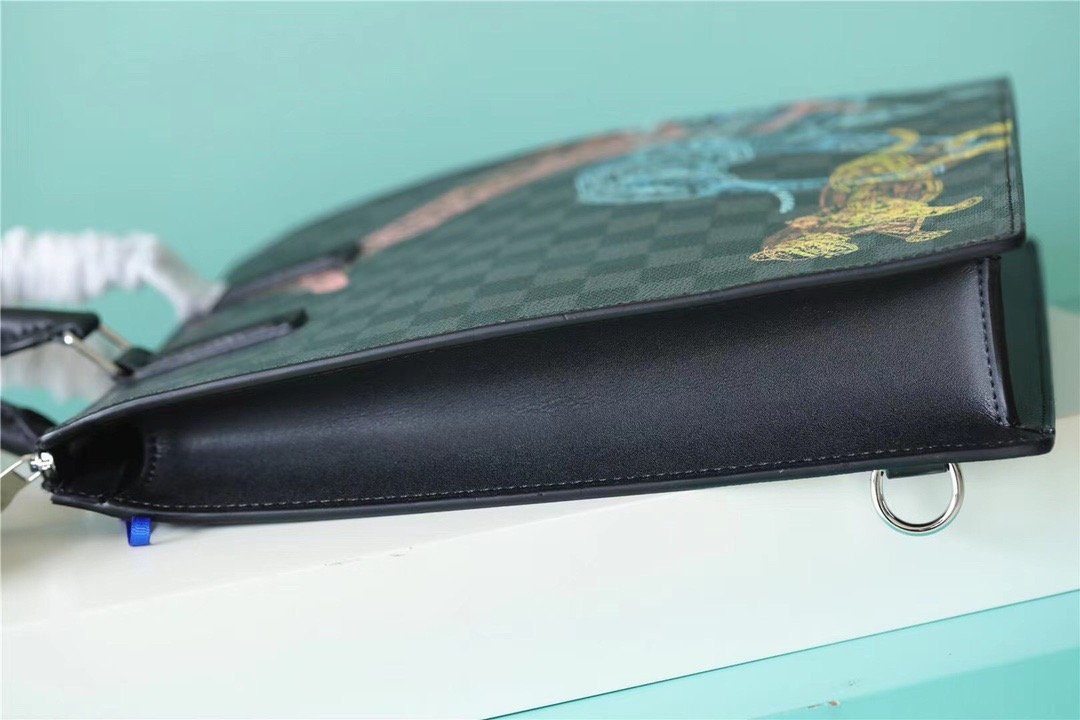 A slim but functional men’s carryall, the Sac Plat Cross bag is made from Damier Graphite canvas with trim. The Damier checkerboard is decorated with a print of wild animals made from an assortment of what looks like passport stamps in pastel colors. This bag has rolled-leather top handles and a removable strap.