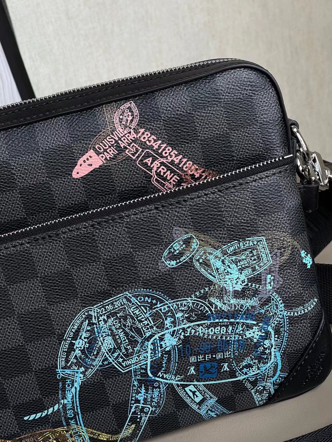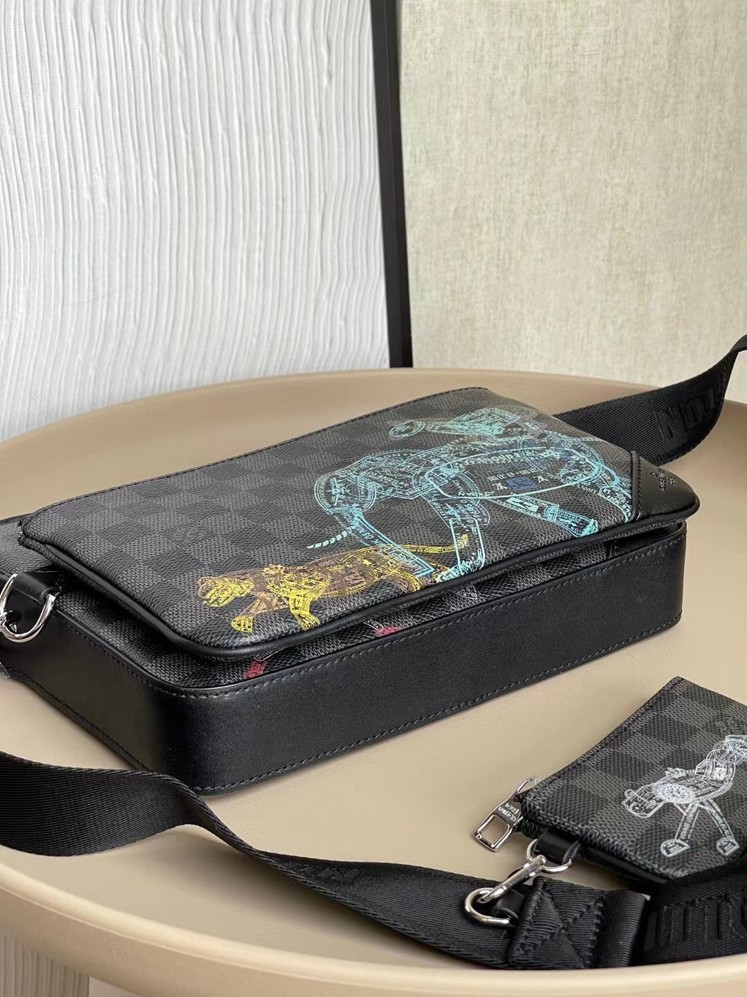 This Trio Messenger is made from Damier Graphite canvas twisted with a print of a herd of wild animals. Closer inspection divulges that the animals are made of passport-style stamps. The Trio is three bags in one: a roomy main compartment with a zipper, a detachable small pouch, and a coin purse attached to the adjustable strap.