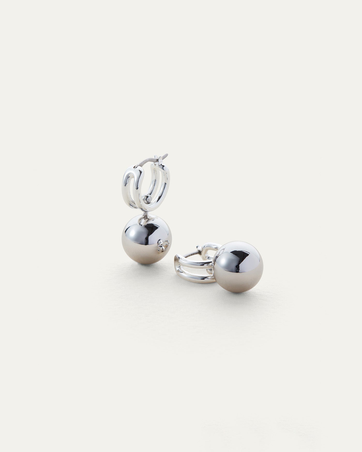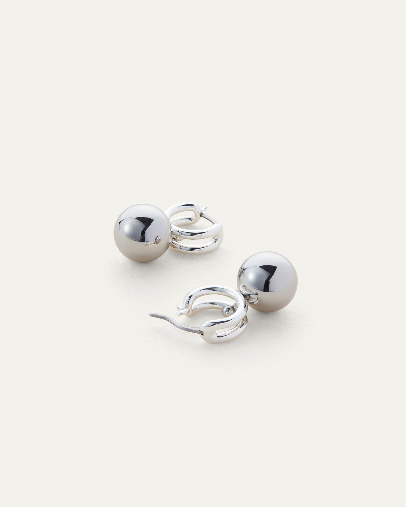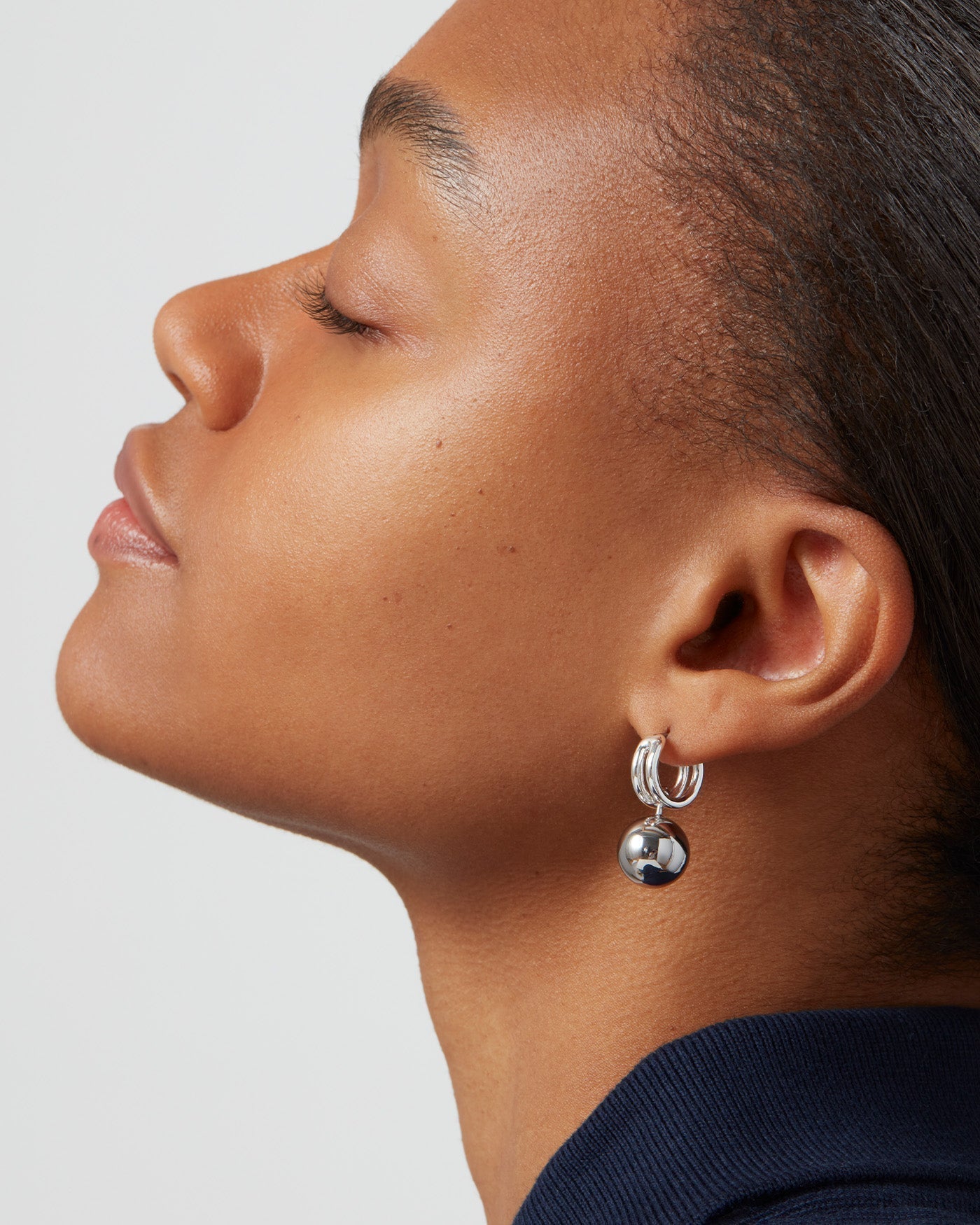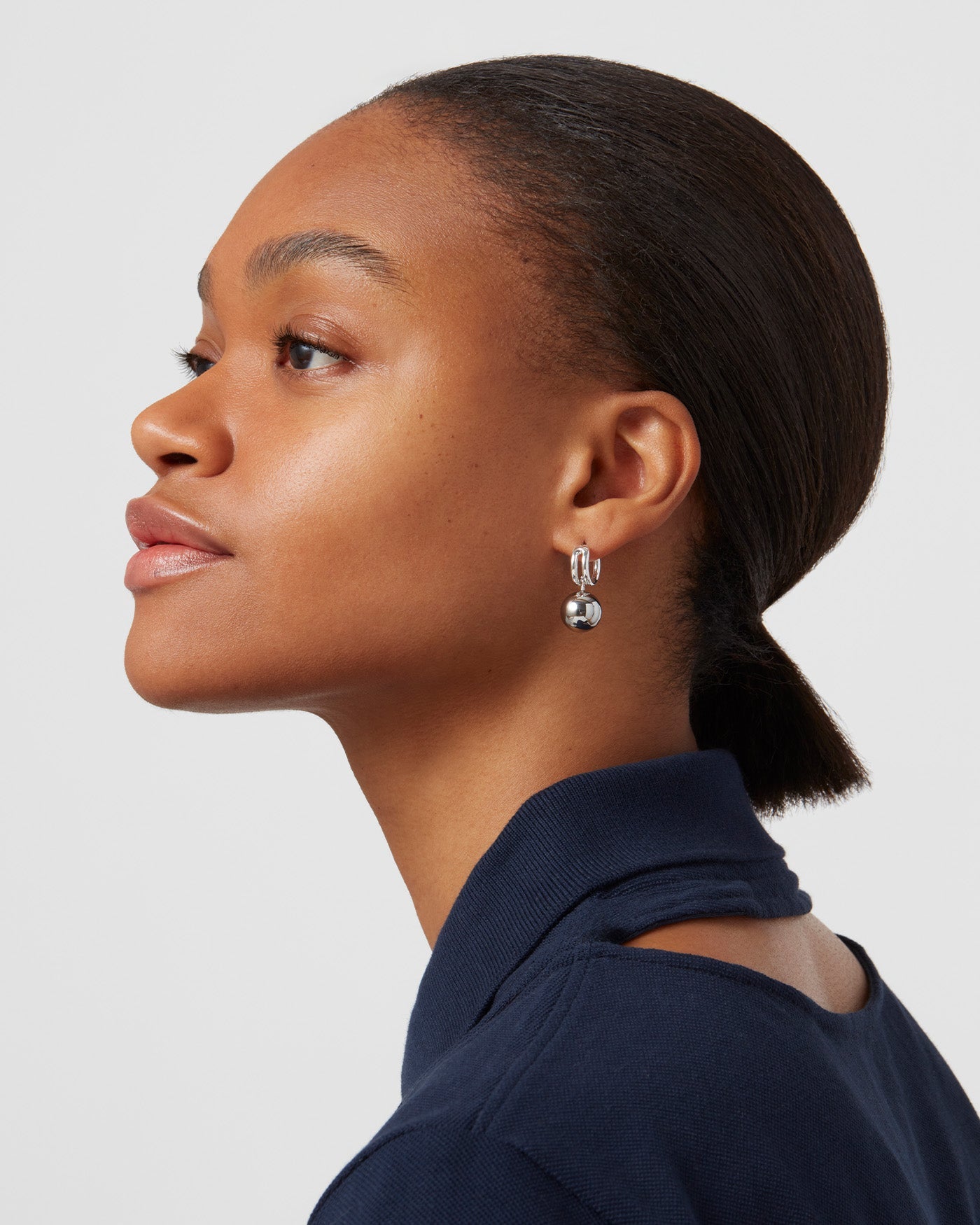 A major engineering feat, these huggies boast an innovative suspension design, allowing a luminous sphere to glide back and forth between a golden rail, creating subtlemovement. Finished in high-polish silver.