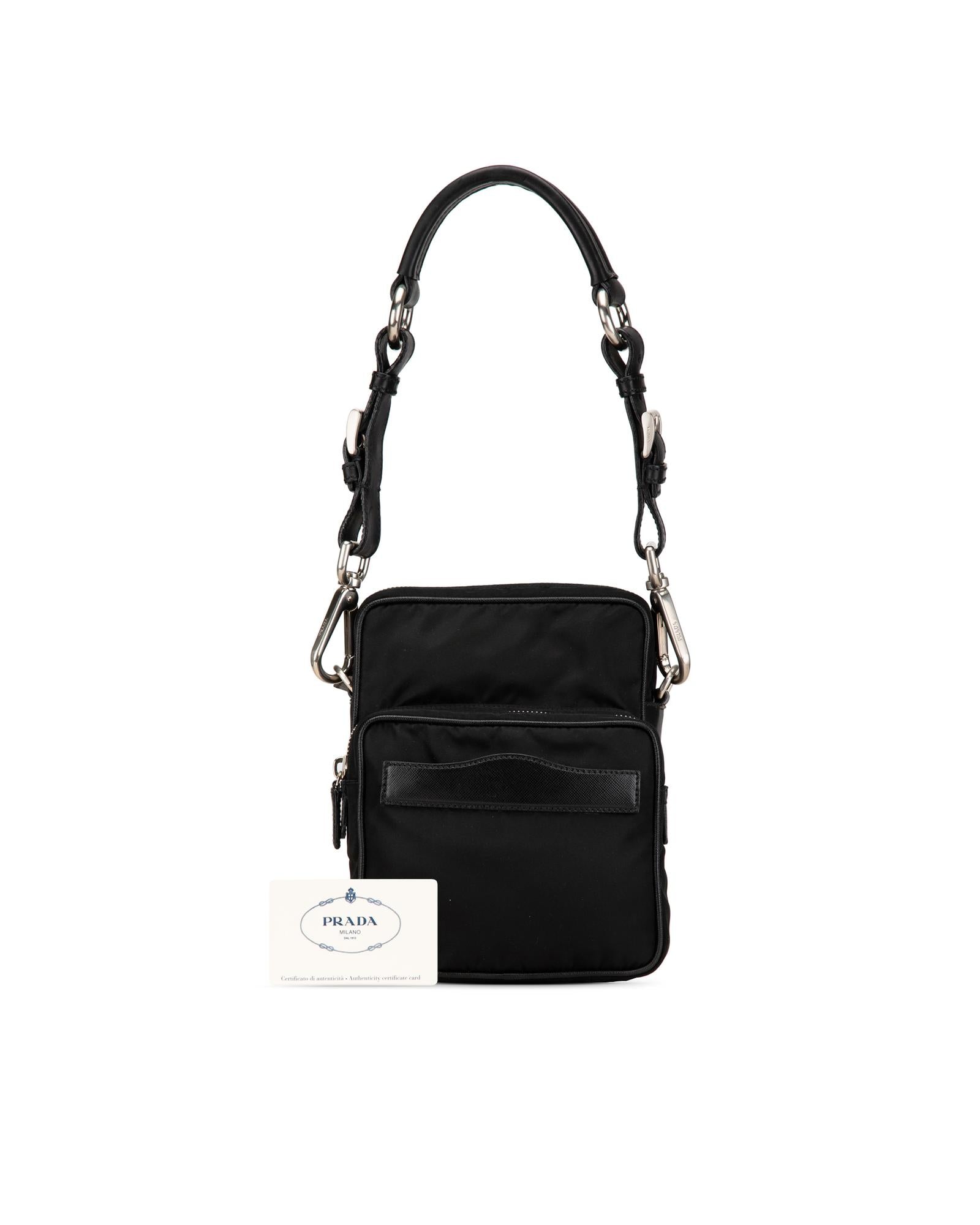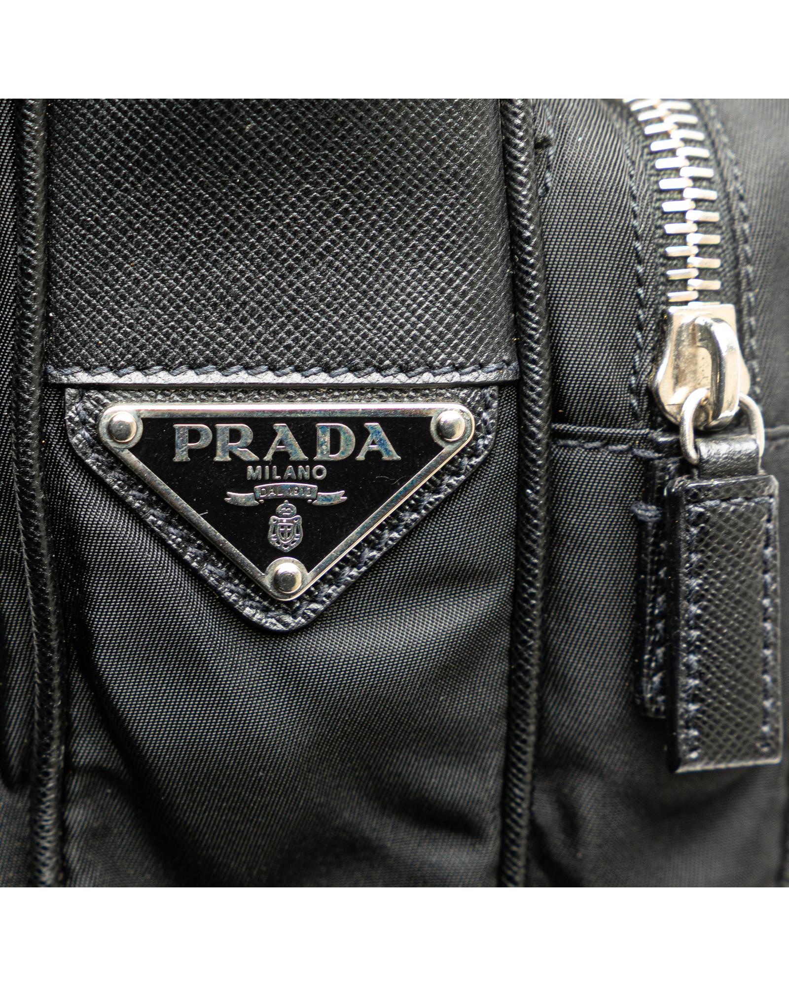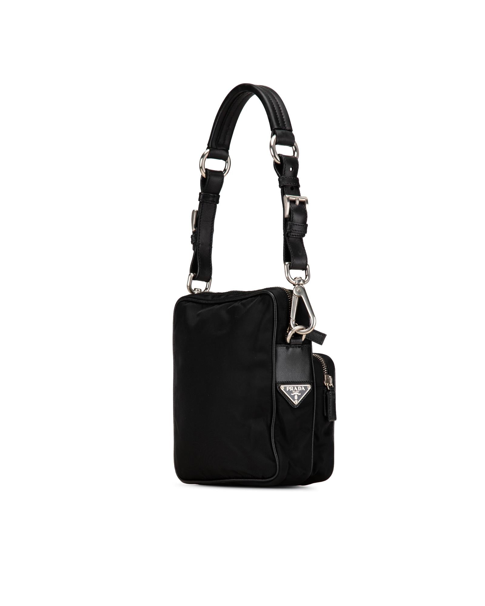 This shoulder bag features a nylon body with saffiano leather trim an adjustable flat leather strap a top zip closure exterior front zip pockets and an interior zip pocket.Brand: Prada