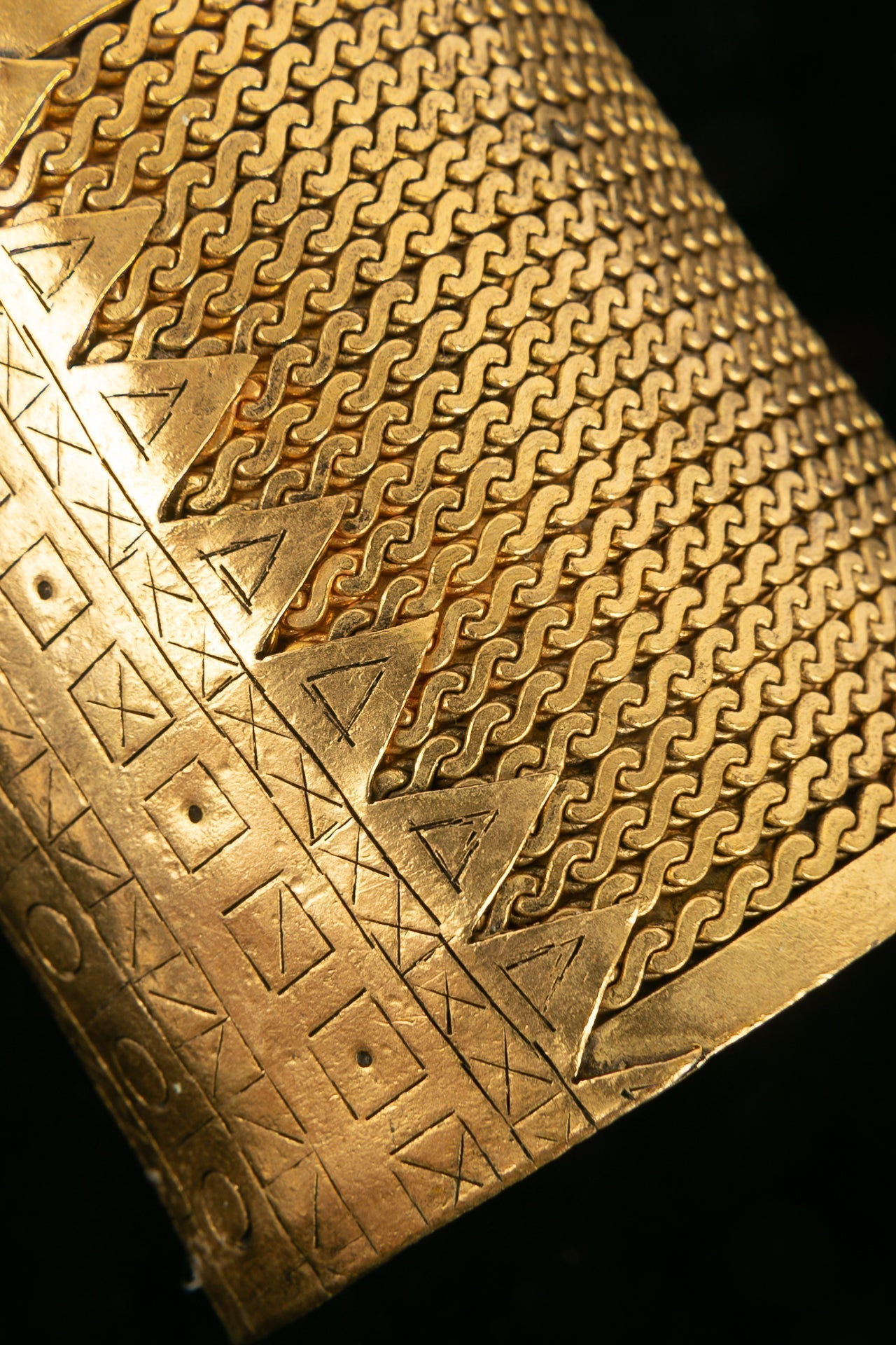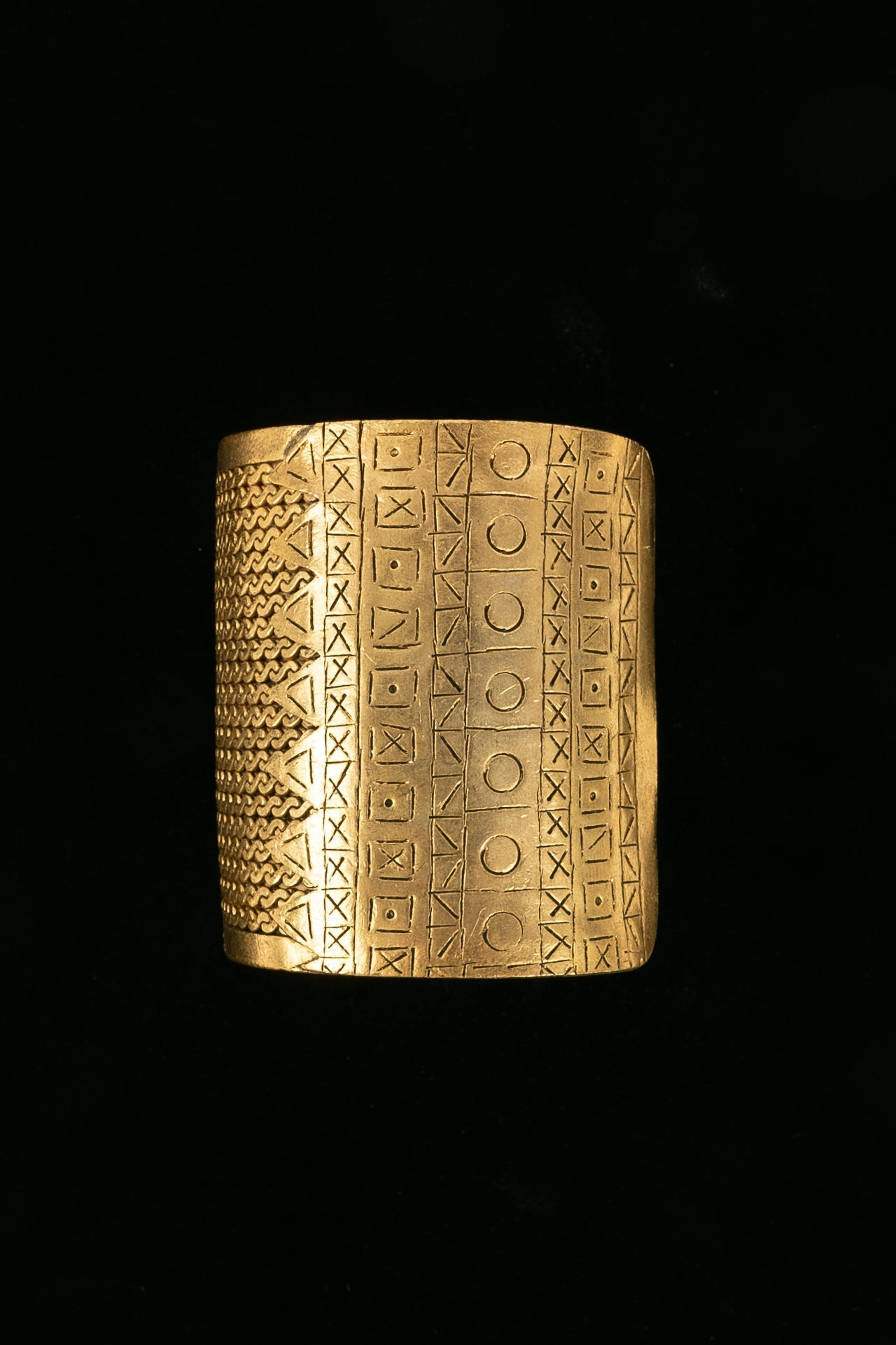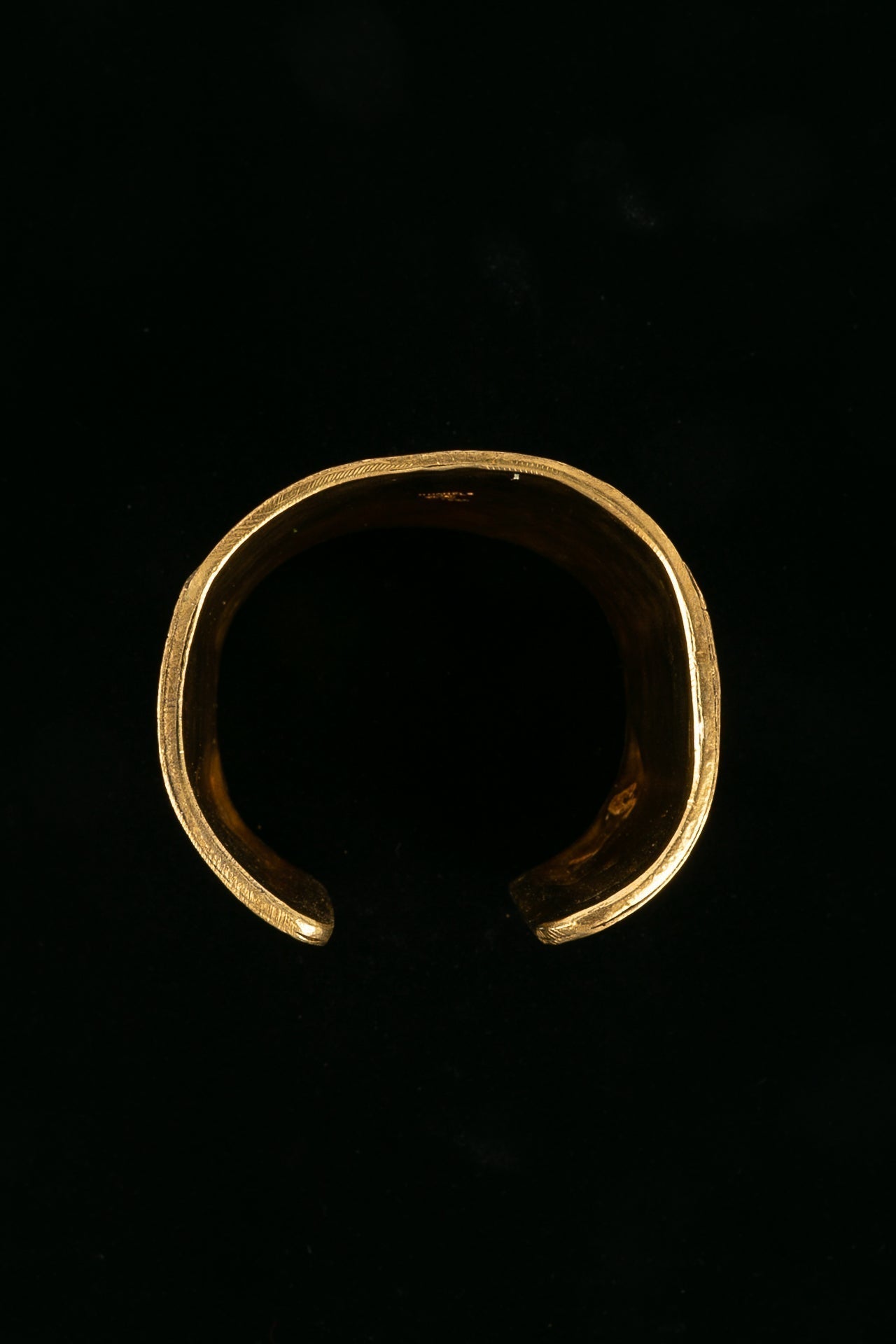 CHANEL -Manchette en m�tal dor� grav�. Collection 1984.