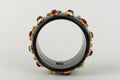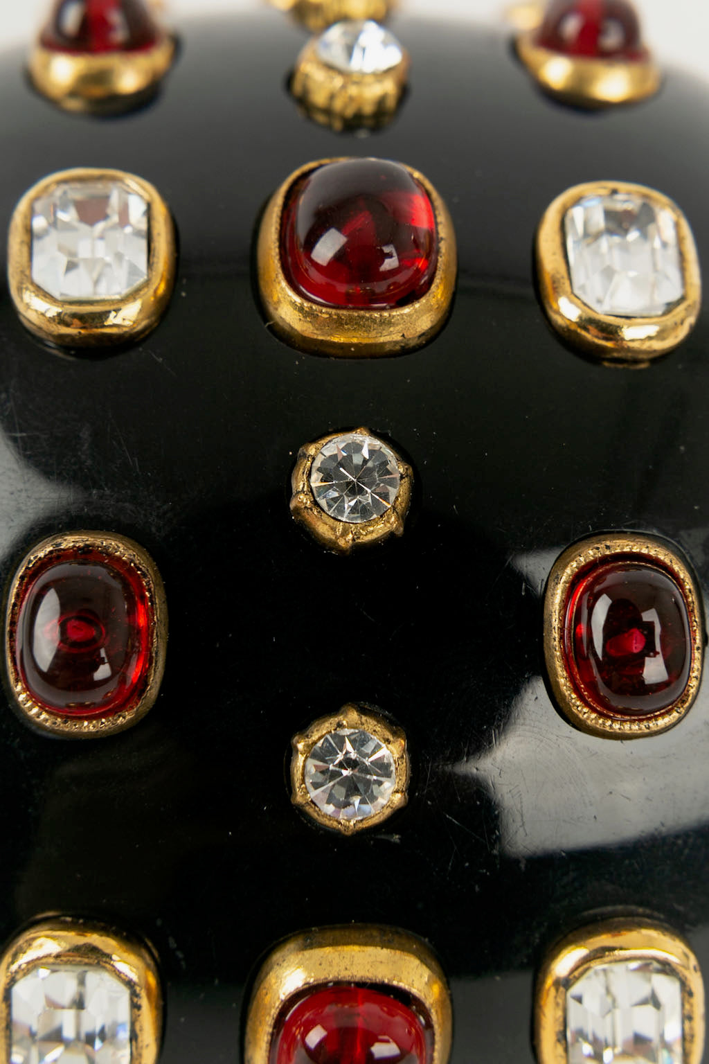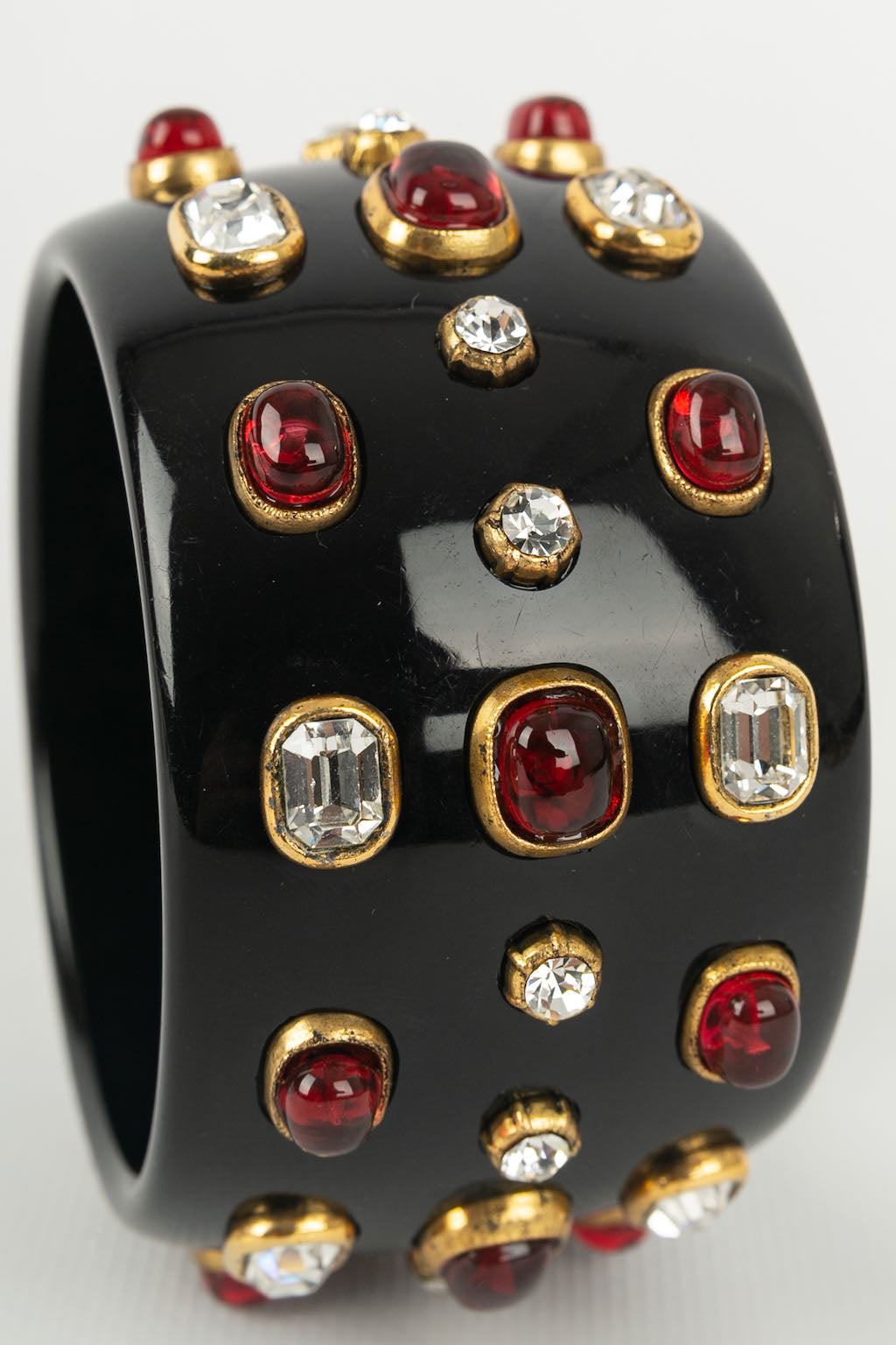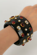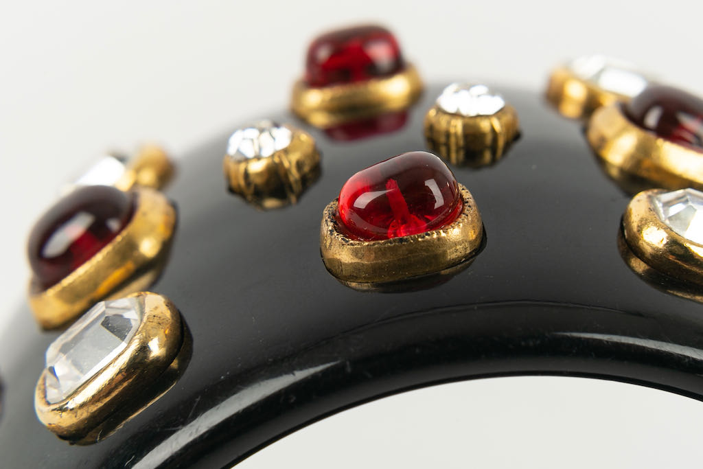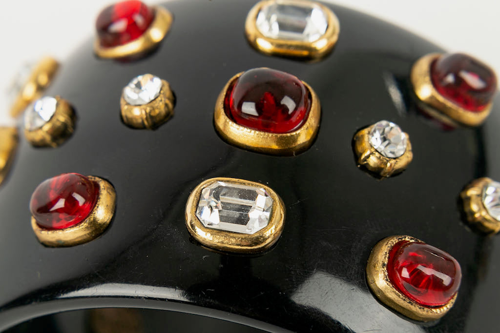 CHANEL -Manchette en bak�lite noire pav�e de strass et cabochons de p�te de verre. Collection 1985.