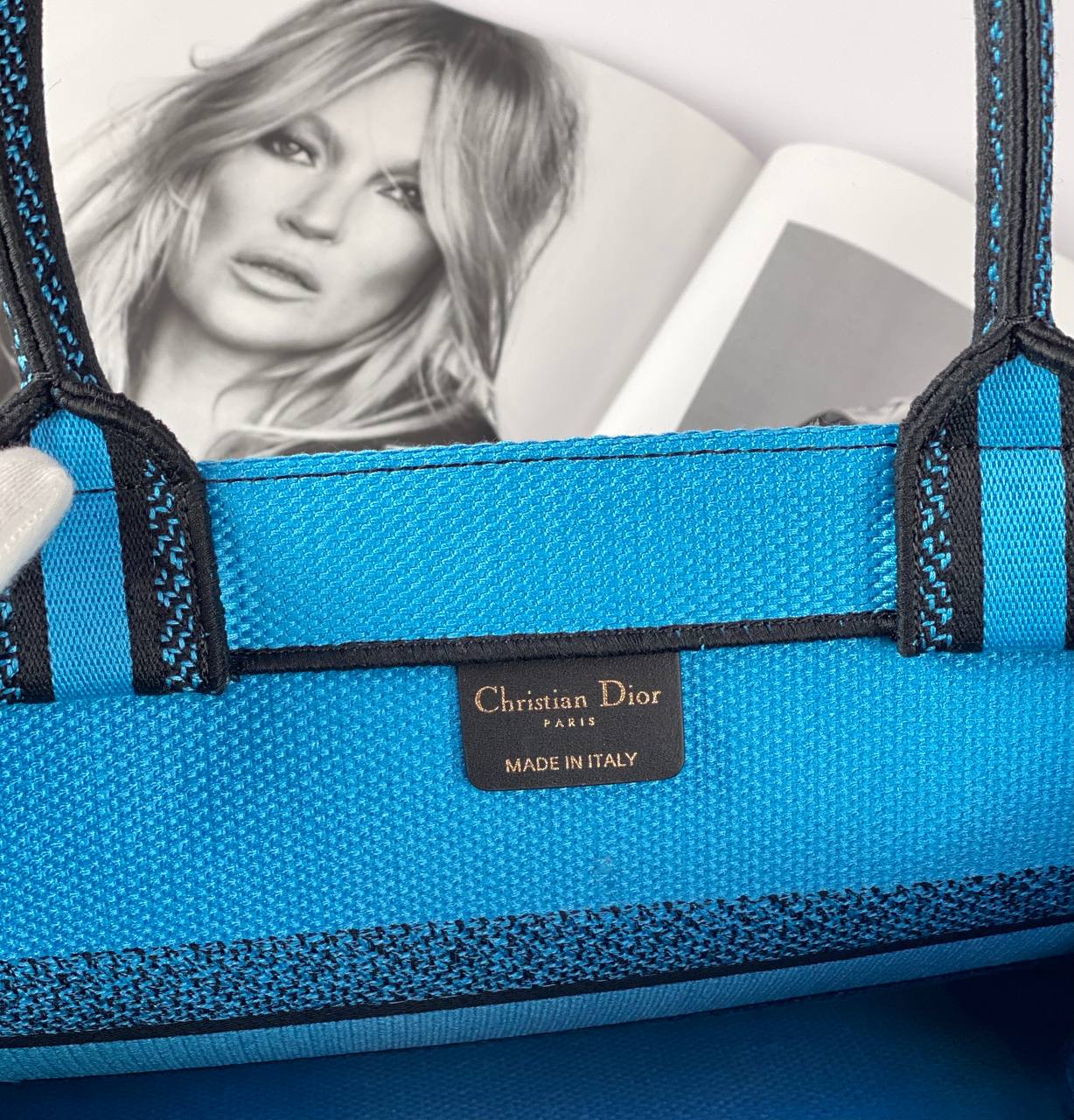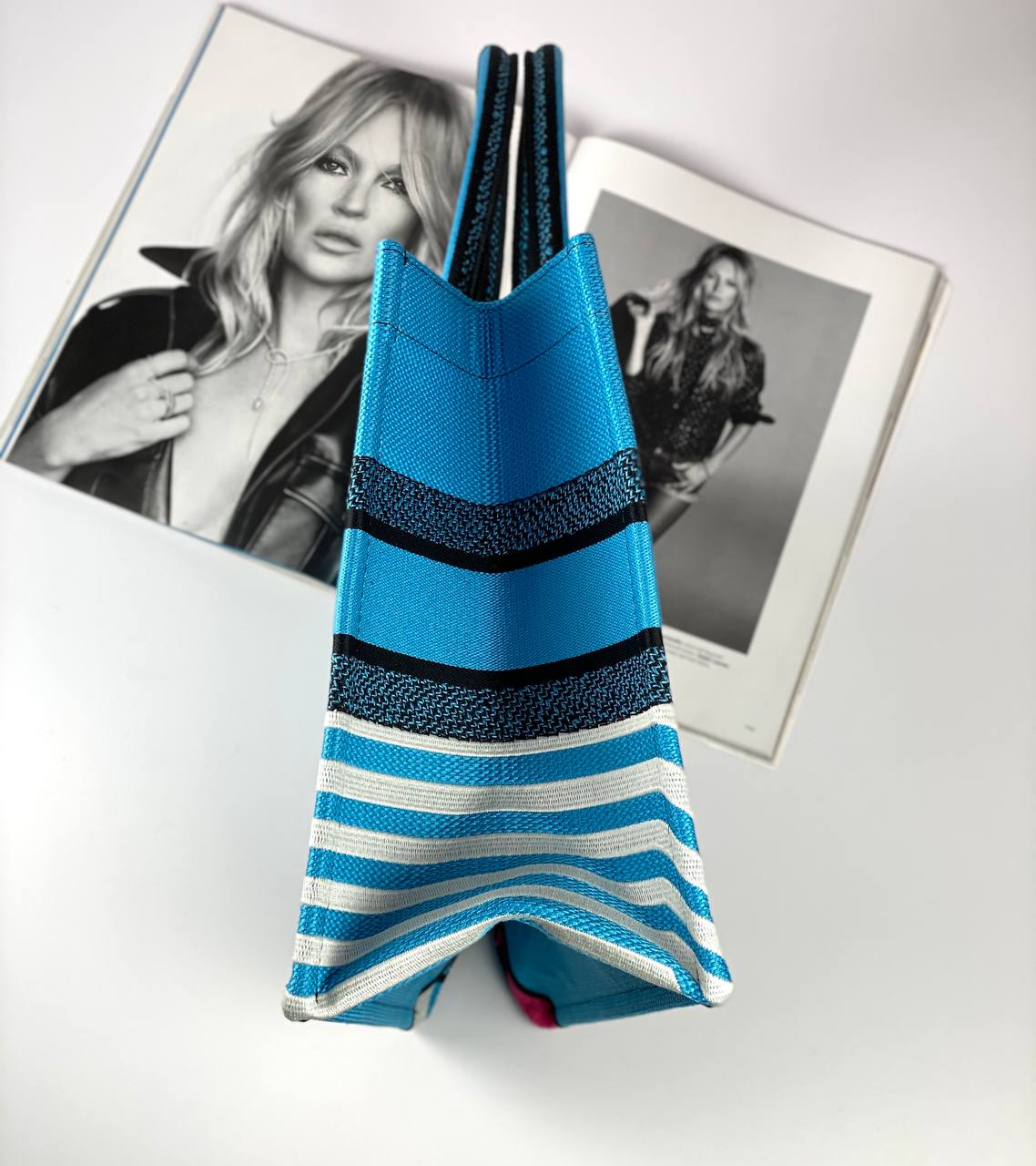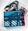 Introduced by Maria Grazia Chiuri, Creative Director of Christian Dior, the Dior Book Tote has become a staple of the Dior aesthetic. Designed to hold the daily essentials, the style is fully embroidered with a bright blue and pink D-Jungle Pop motif that embodies the collection's colorful pop inspiration. Adorned with the 'CHRISTIAN DIOR PARIS' signature on the front, the large tote exemplifies the House's signature savoir-faire and may be carried by hand or over the shoulder.