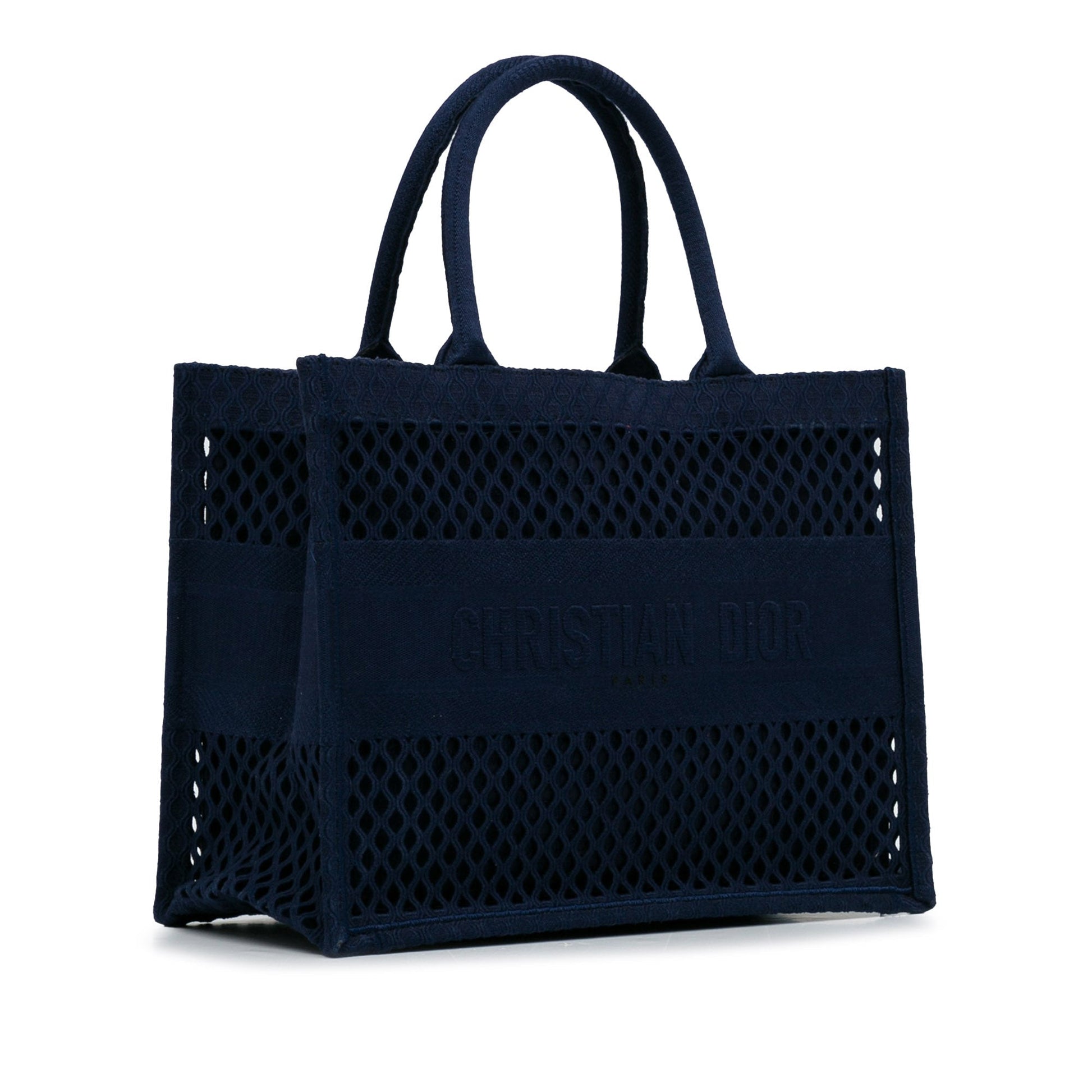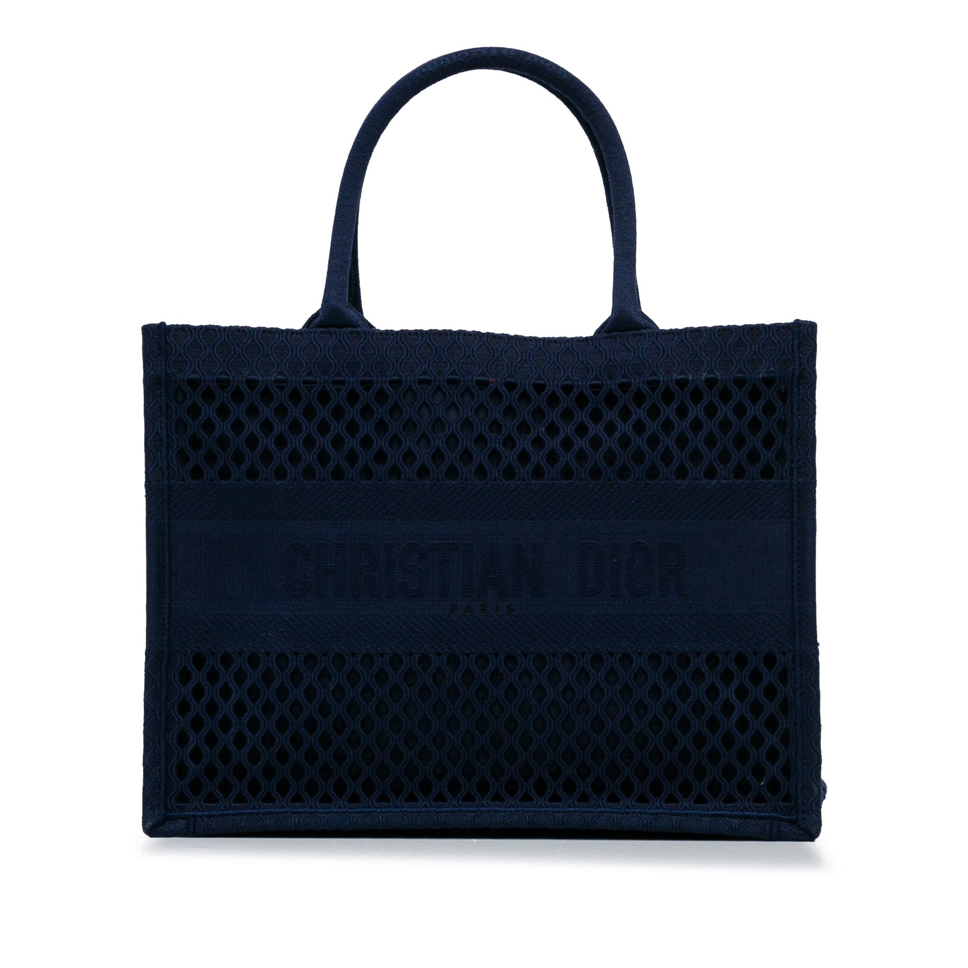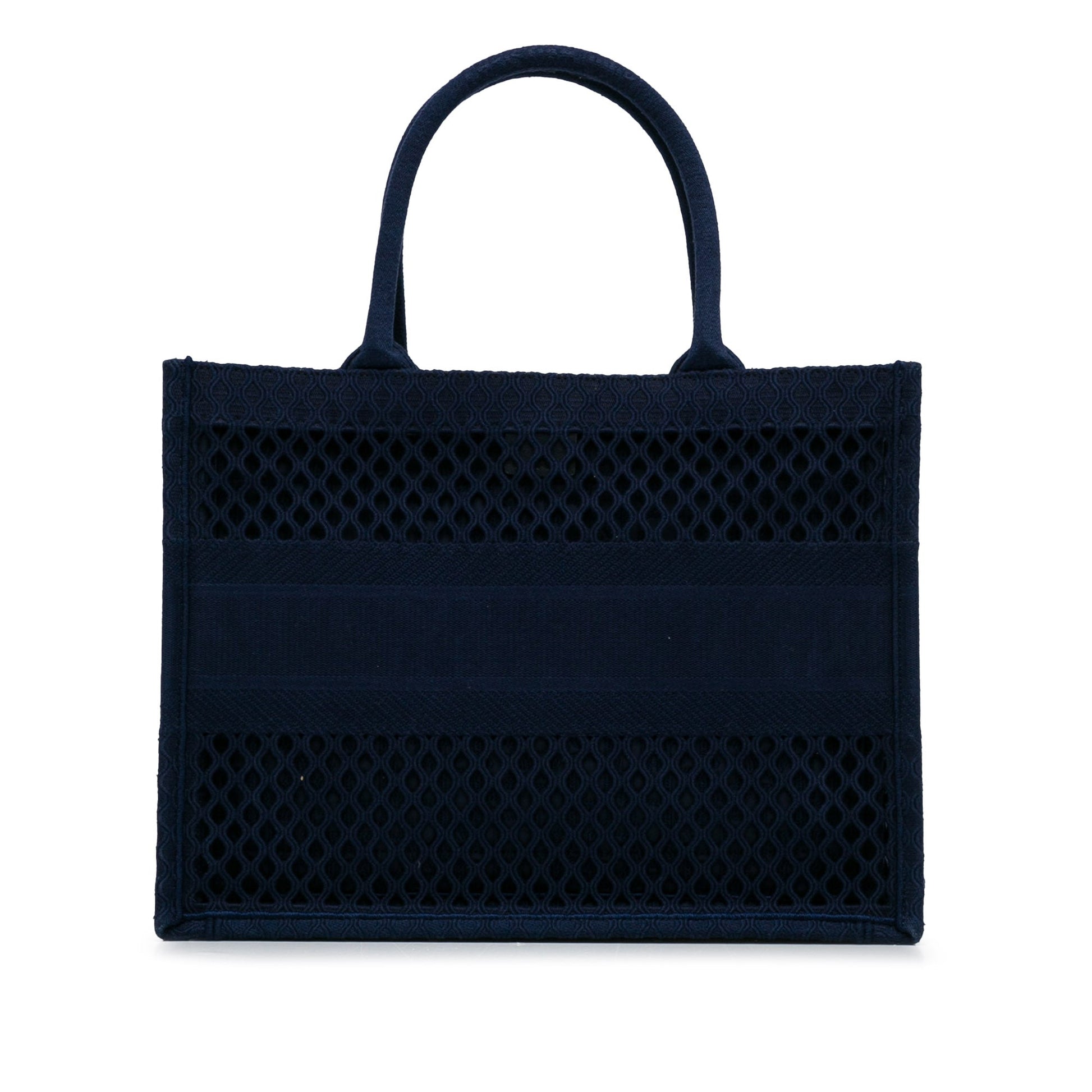Diese schöne Version der Dior Book Tote Medium ist aus blauem Mesh gefertigt und verfügt über einen halbhohen Einsatz aus gewebtem Dior-Band, gerollte Henkel und eine offene Oberseite für einen leichten Zugang zum Innenraum. Die Tasche kann in der Hand oder am Arm getragen werden.