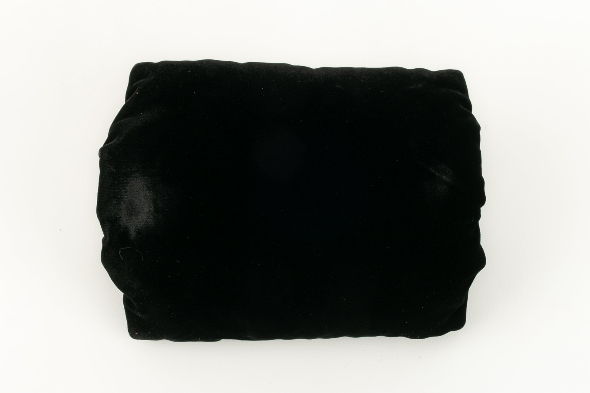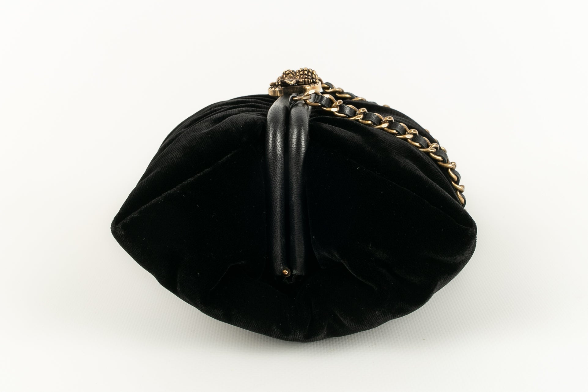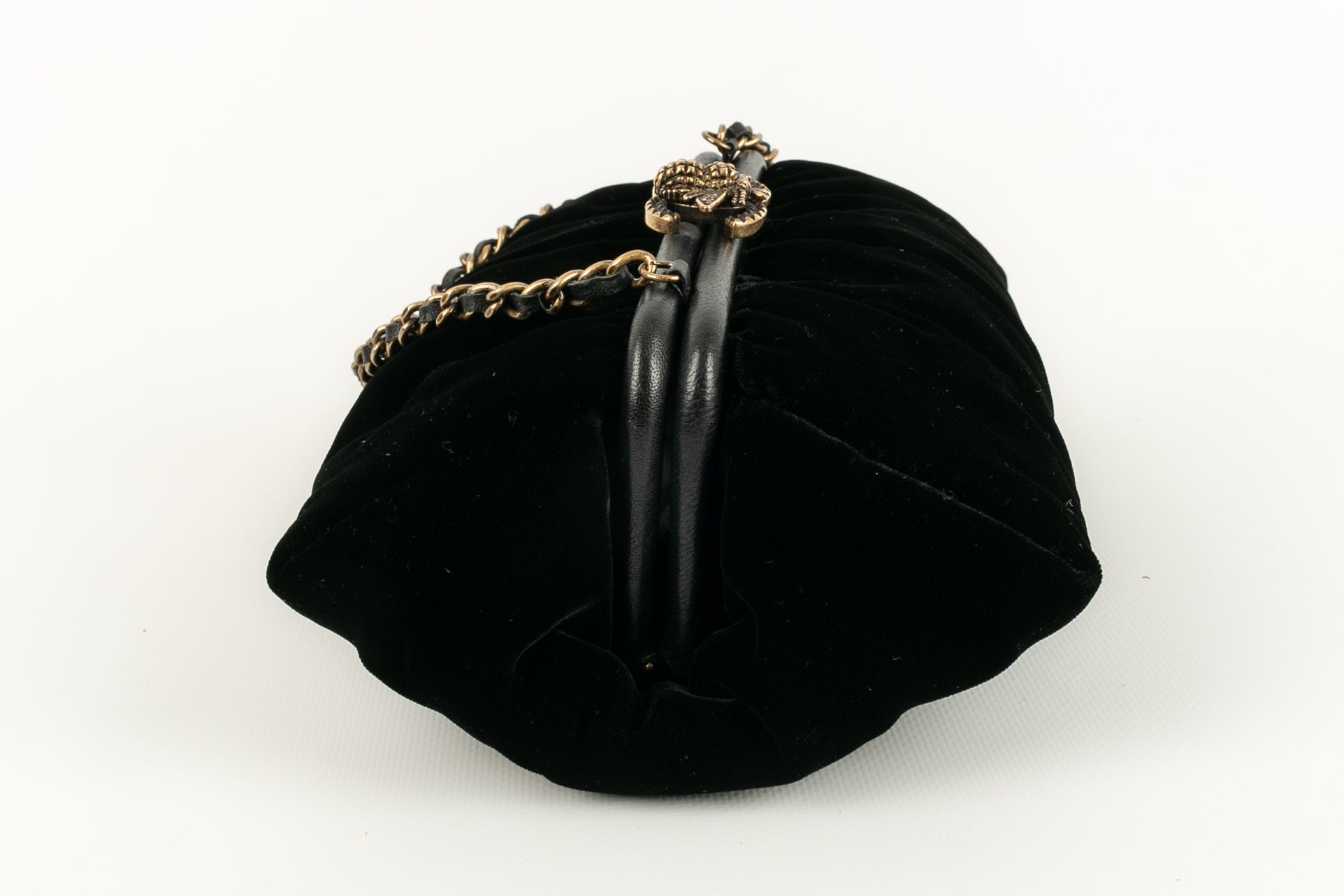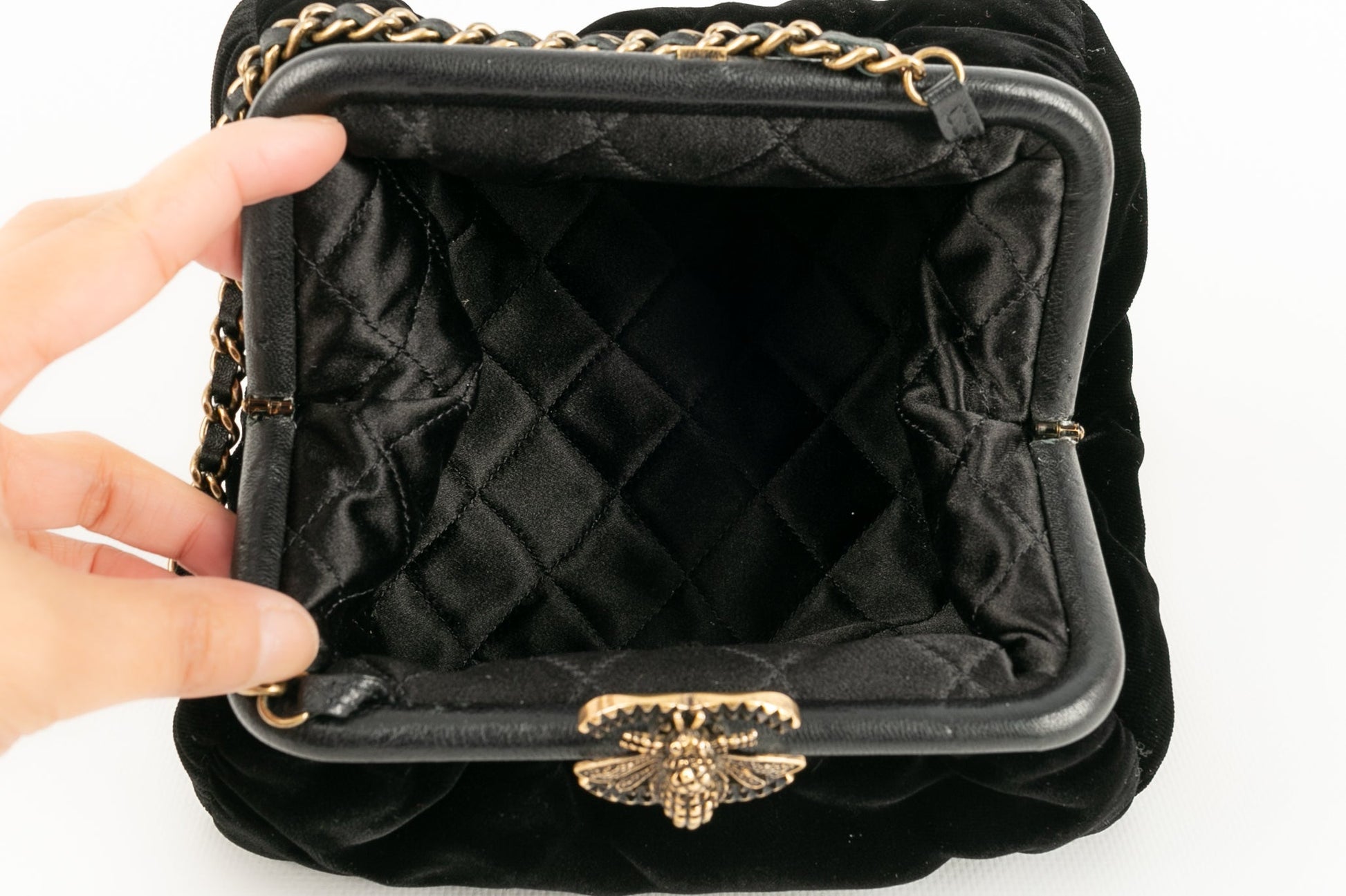CHANEL -(Made in Italy) Minaudi�re en velours et cuir noir, attributs en m�tal dor� fonc�. Sac issu de ventes priv�es.