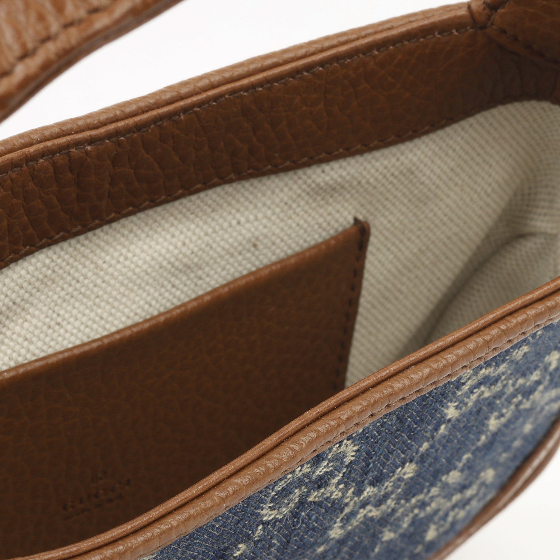 Introducing the Jackie 1961 Mini Bag for Fall/Winter 2020—a contemporary reinterpretation of a historical Gucci icon. Crafted from denim monogram GG, this version brings a fresh perspective to the recognizable shape. The bag is constructed in GG Supreme canvas, accentuated by an additional detachable shoulder strap. The second strap, attached with a buckle closure, infuses a modern touch into the archival design, offering versatile ways to wear—from top handle to shoulder and crossbody.