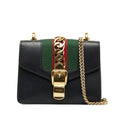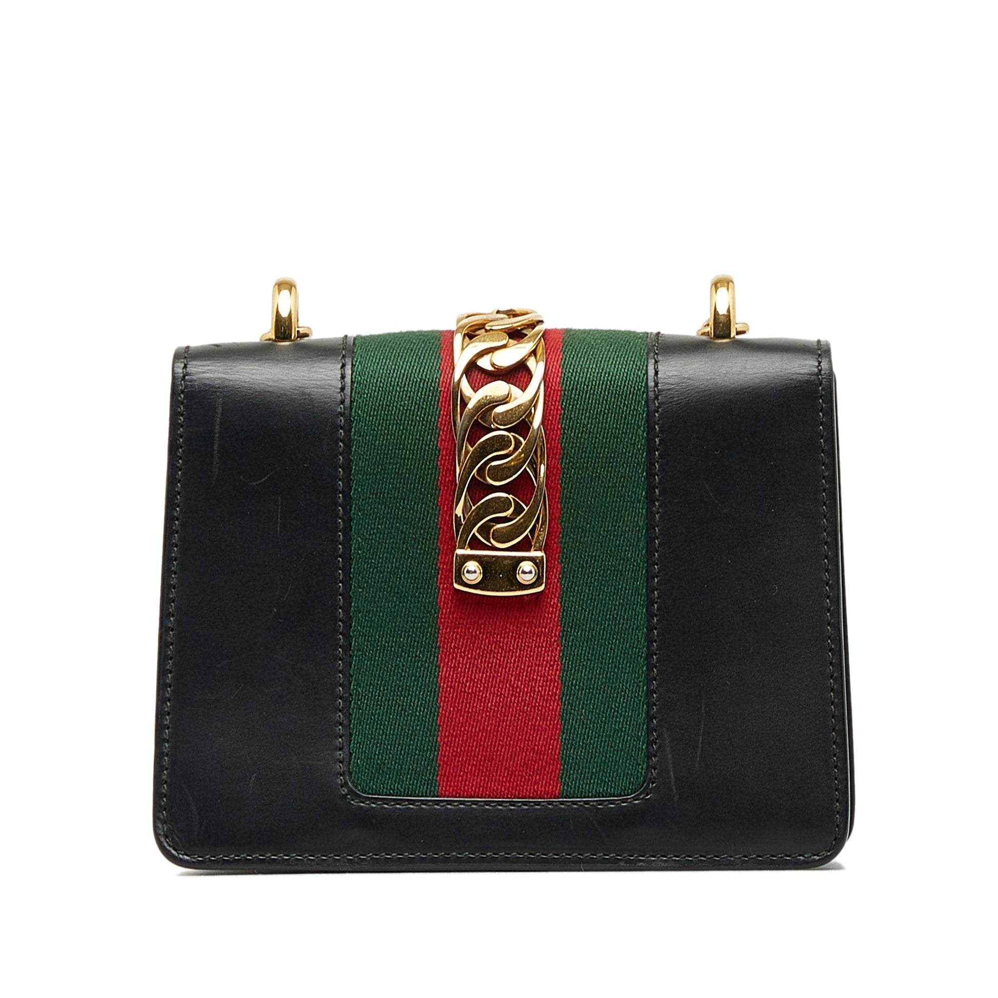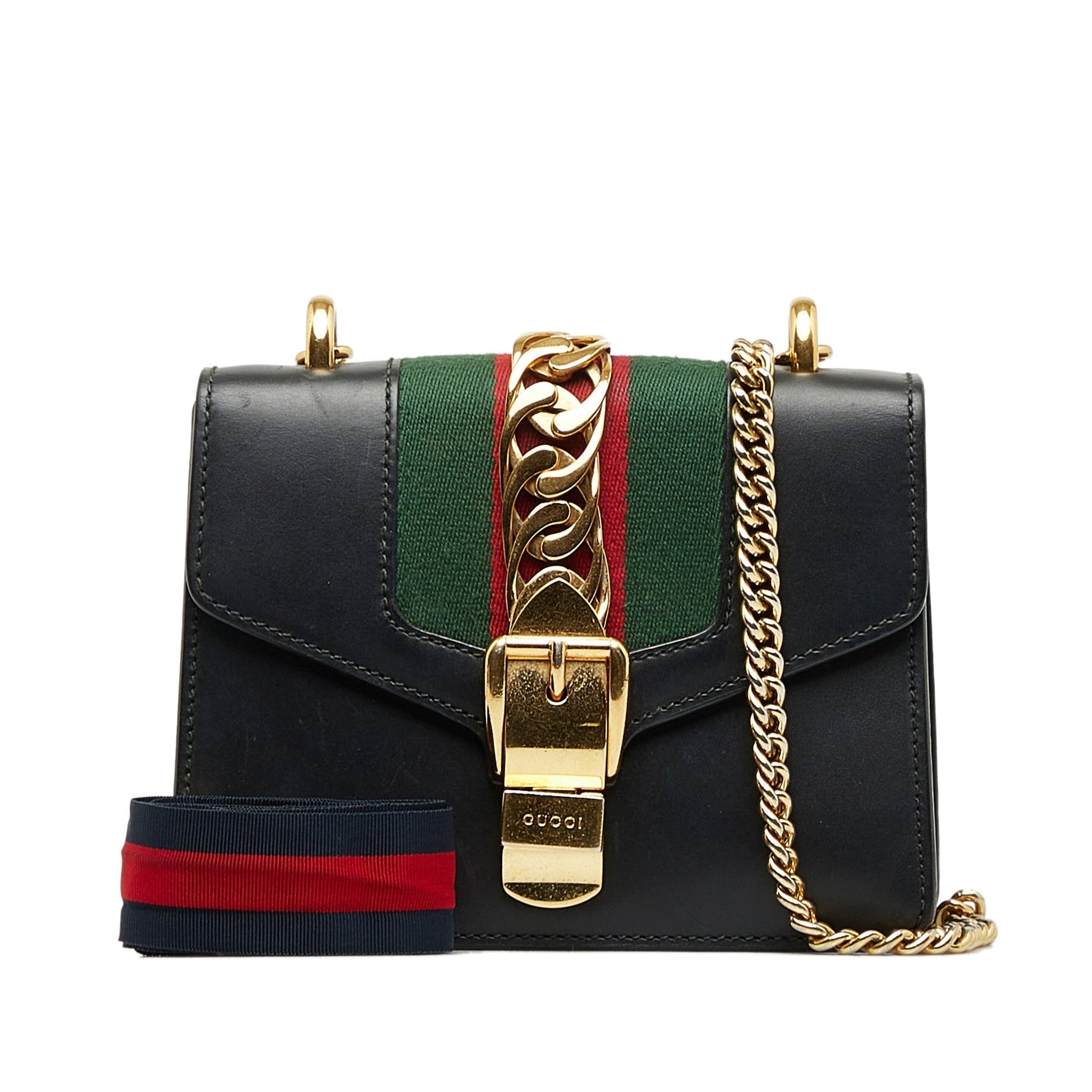 This elegant Gucci Sylvie Super Mini is made from black leather and features a gold chain trim and gold details. The inside of the Bag consists of a small storage space without compartments or a zipper. Super elegant!