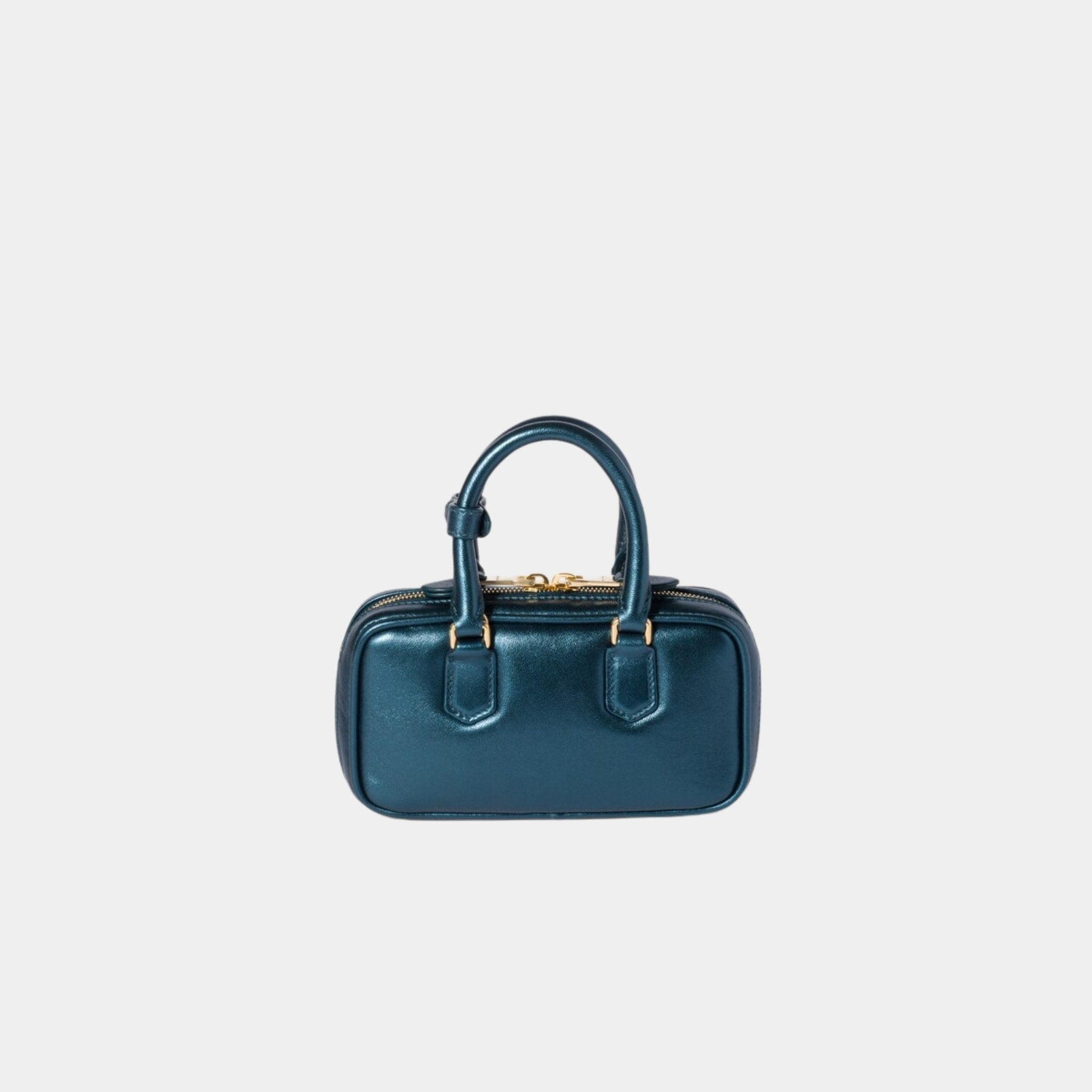 The Miu Miu Arcadie Laminated Nappa Leather Mini Bag is a stylish and compact accessory, designed to balance functionality with a bold, fashion-forward aesthetic. Crafted from luxe laminated nappa leather, this miniature handbag shines with a metallic finish, making it a statement piece for both day and evening wear.