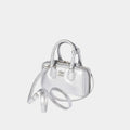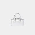 Designed for versatility, the bag features a detachable and adjustable leather shoulder strap, allowing it to be worn as a chic handbag or a cross-body bag. The steel hardware and metal lettering logo on the front add a contemporary touch, while the zipper closure ensures security. Inside, a cotton satin-lined interior with a card slot provides just enough space for essentials, keeping everything organized in a sleek, structured silhouette.