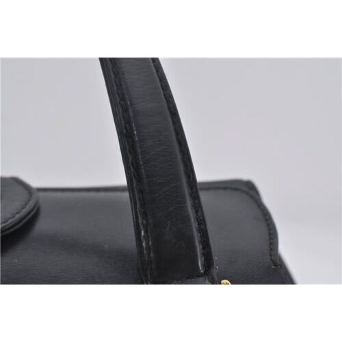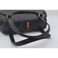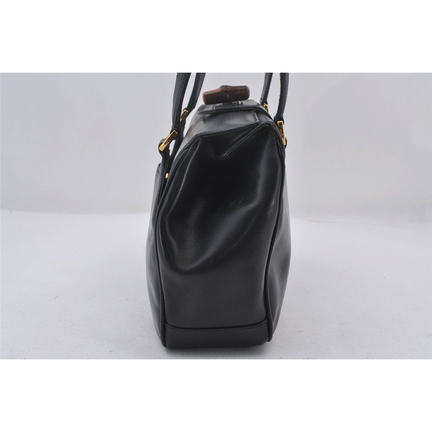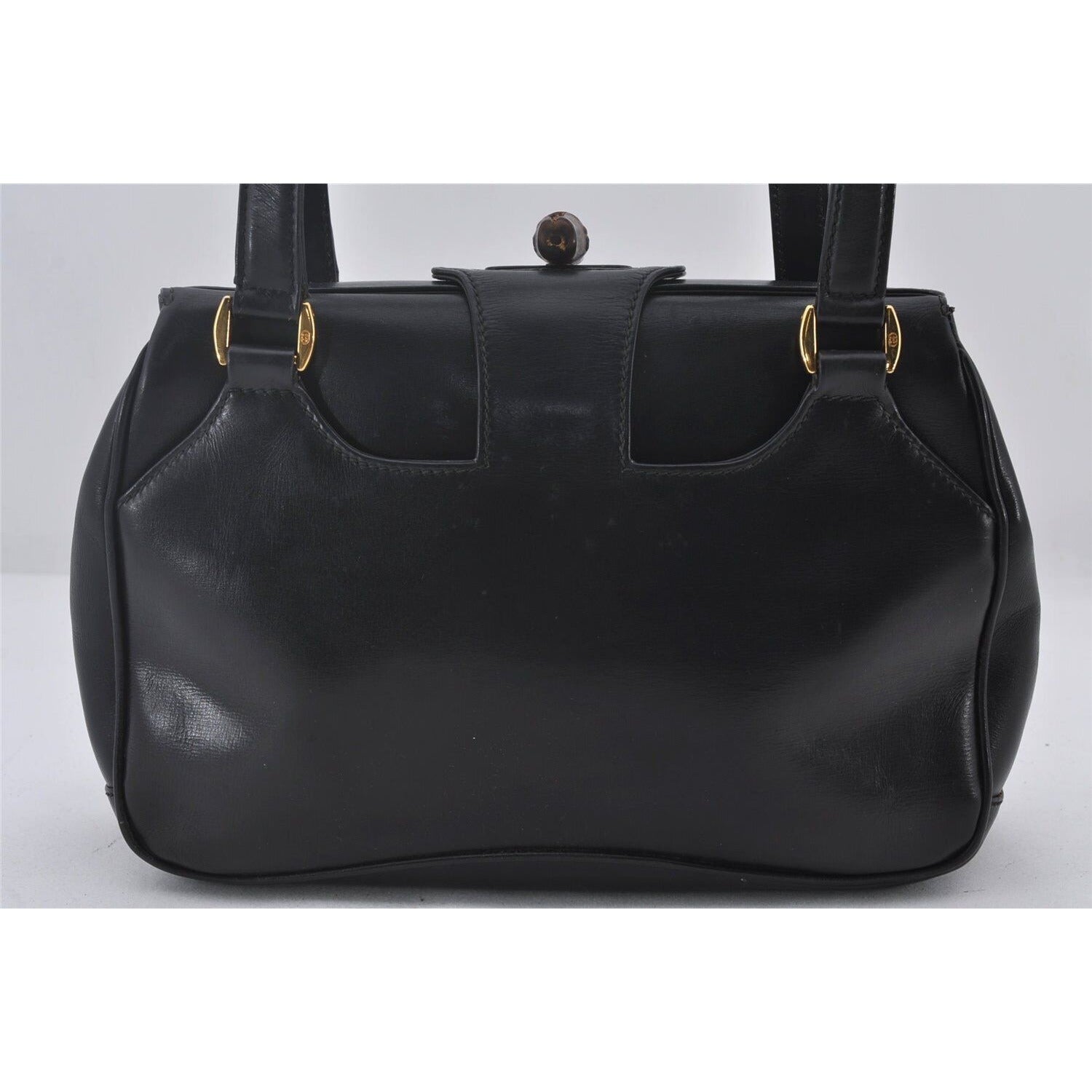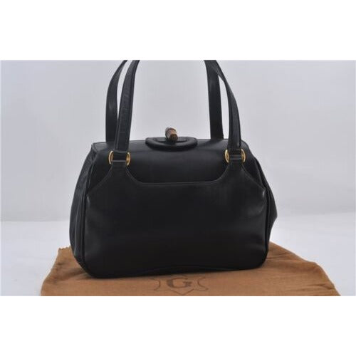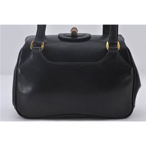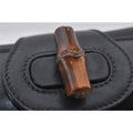 Mod Gucci, black leather shoulder bag with two longer straps, two exterior pockets, a hinged opening, and a gold and bamboo accent clasp